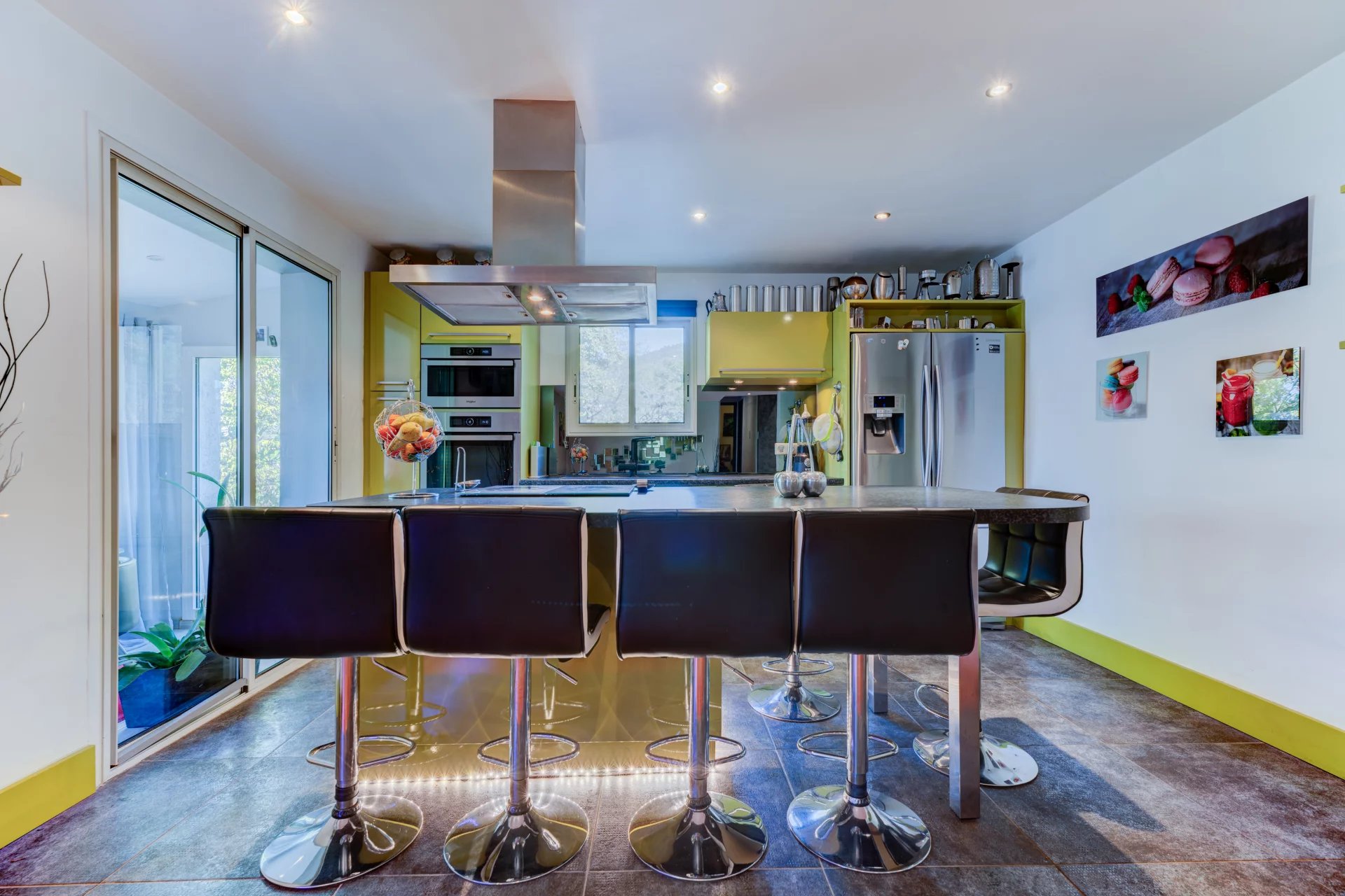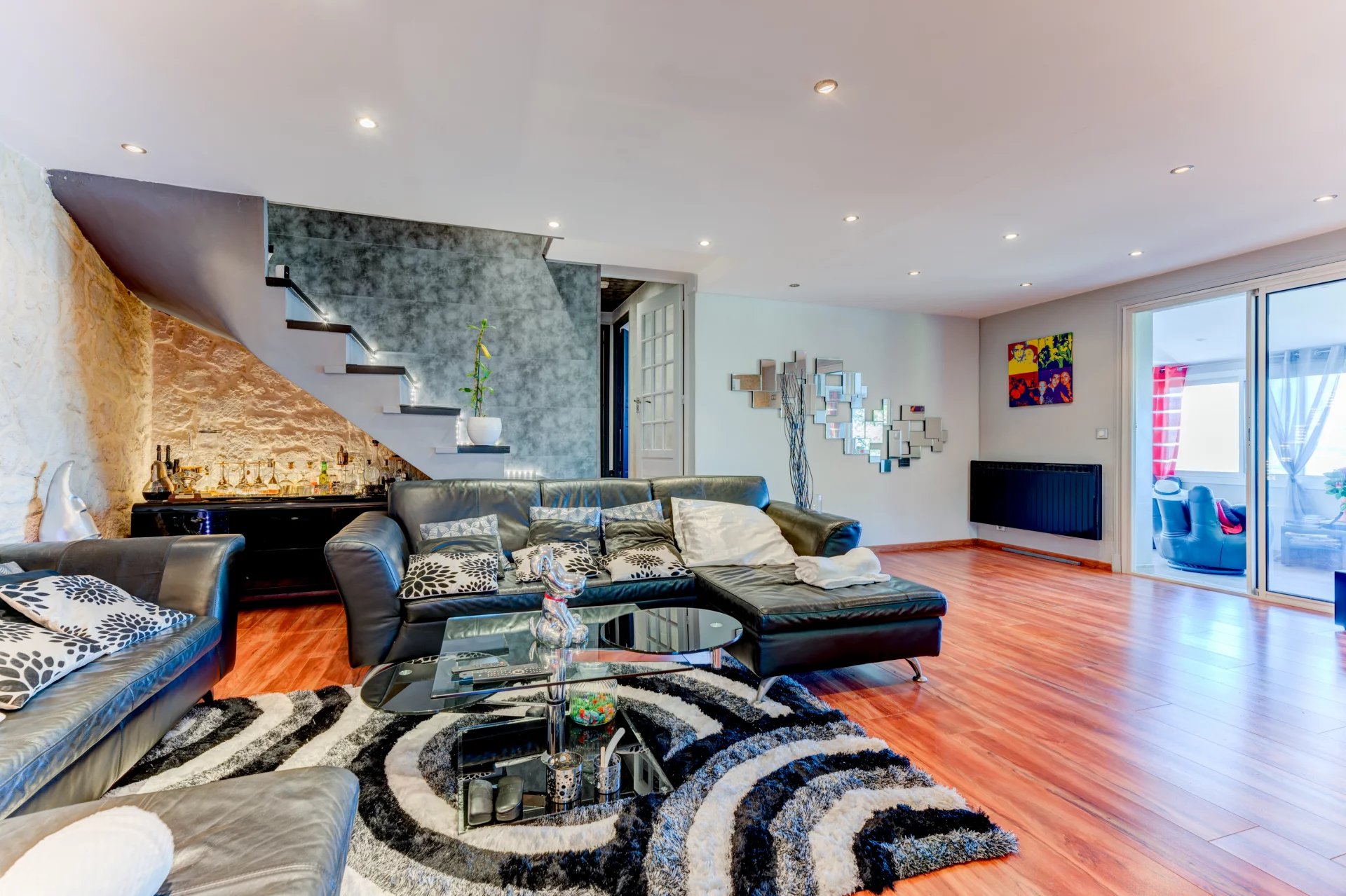 La villa comprend au niveau principal une entrée, un séjour lumineux avec cuisine ouverte équipée, deux chambres, une grande salle de bains, et une salle à manger avec vue panoramique. À l'étage, une autre chambre climatisée avec salle d'eau privative ainsi qu'un grand grenier aménagé en salle de jeu. Au niveau inférieur, un appartement deux pièces indépendant, idéal pour recevoir