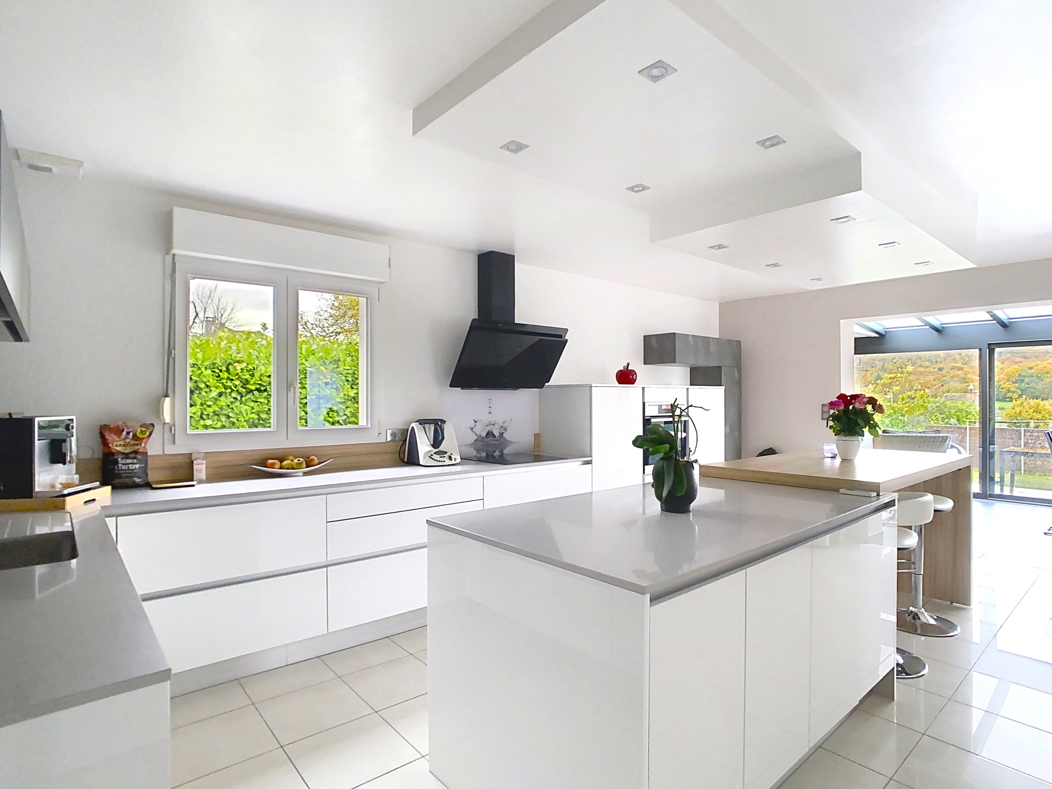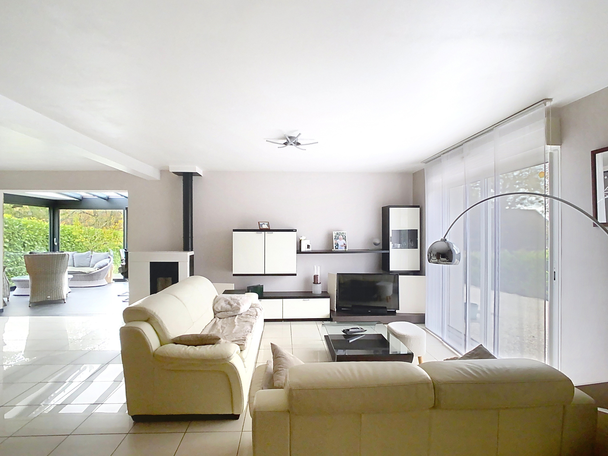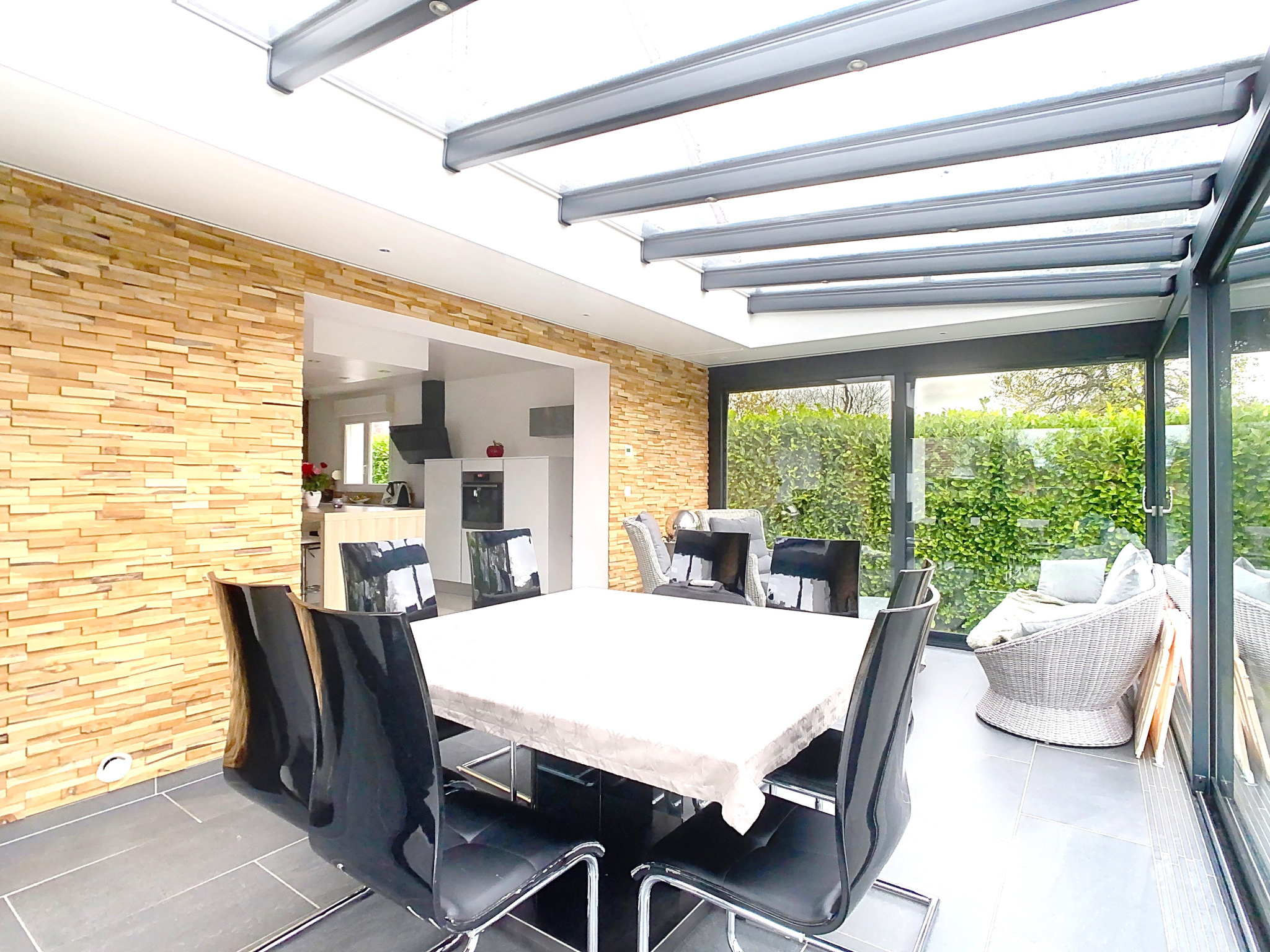 Elle comprend une vaste entrée avec placards, une cuisine aménagée et équipée avec cellier fermé, un séjour donnant sur jardin, et une véranda en alu bioclimatique basse consommation de 20m2 avec plancher chauffant.