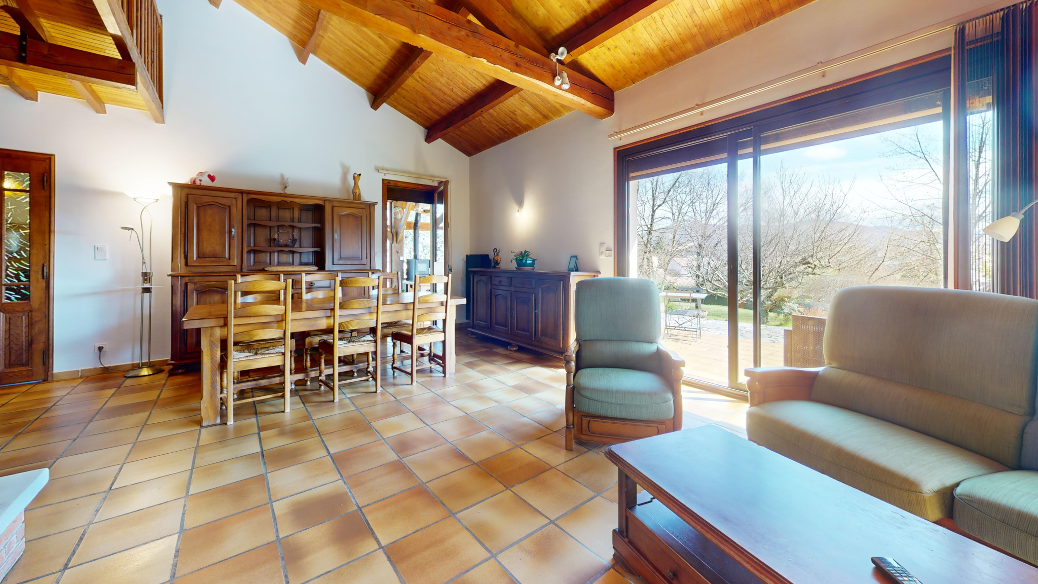 Grande partie jour cathédrale de 65 m2 environ avec un insert, bureau en mezzanine, cuisine séparée équipée/salle à manger de 18m2 environ donnant sur une véranda de 20 m2 environ avec poêle de 2010.