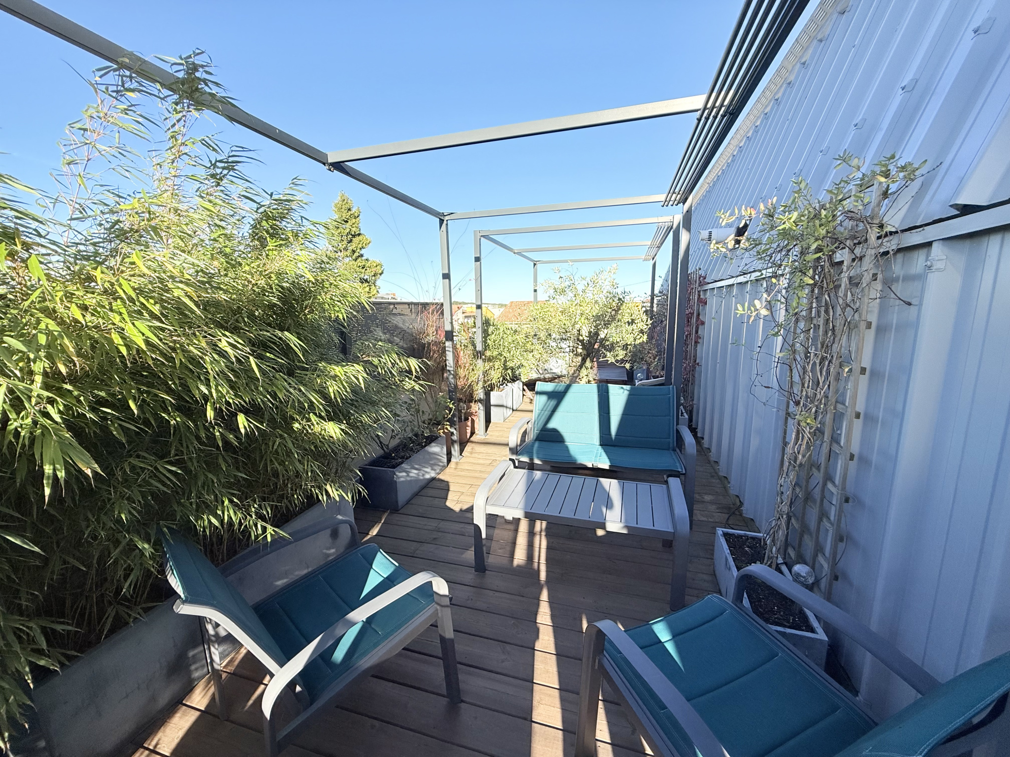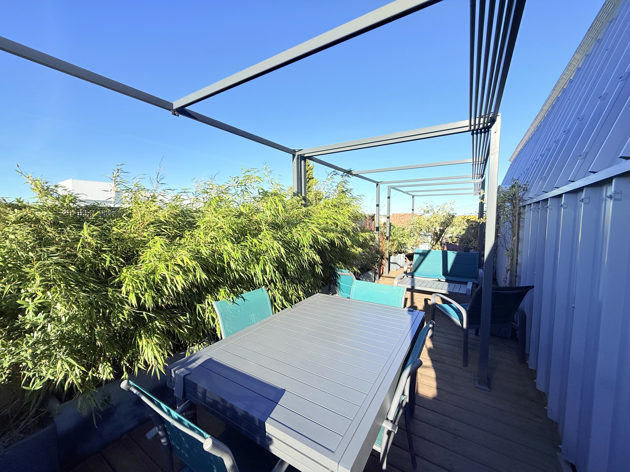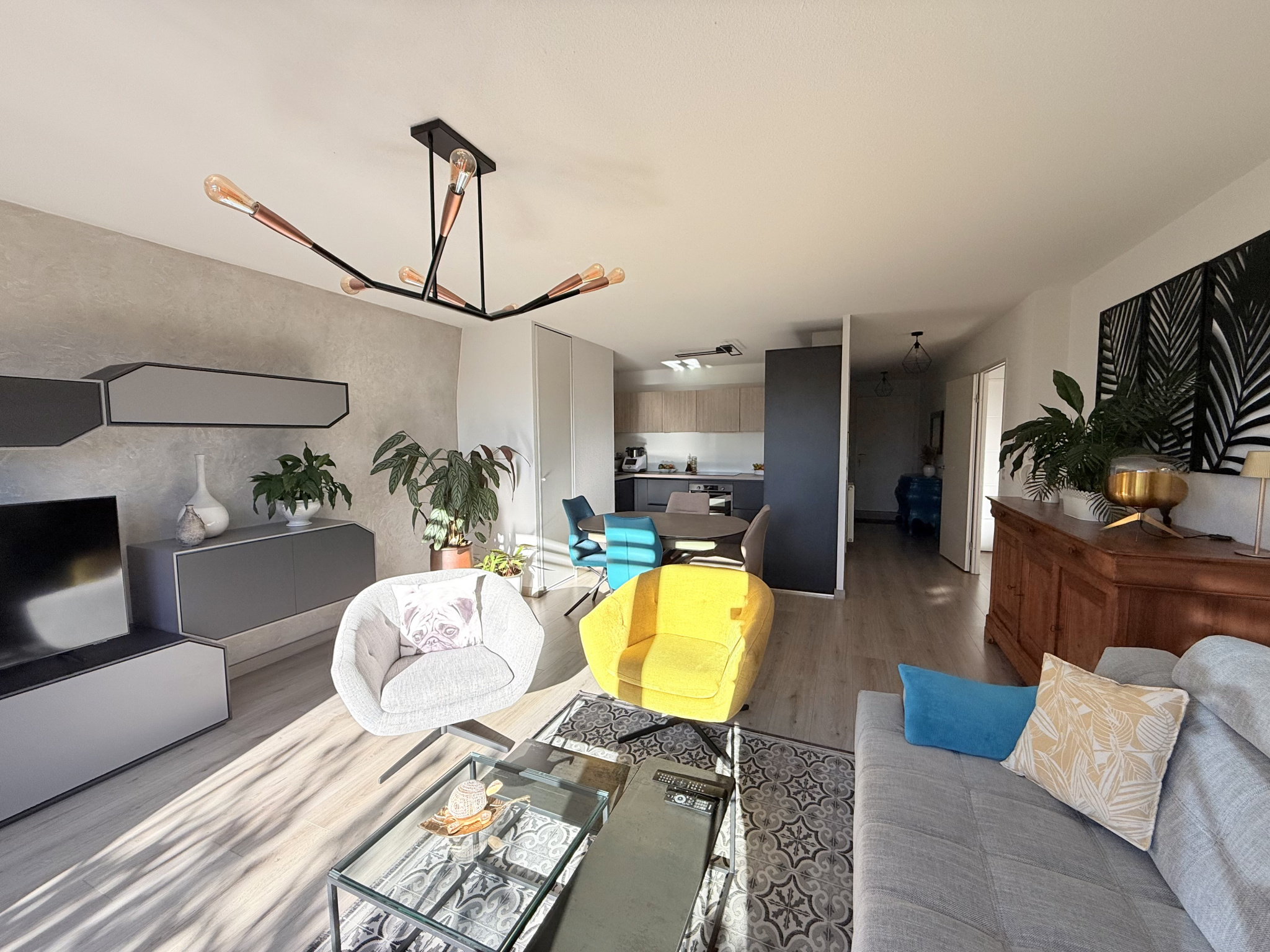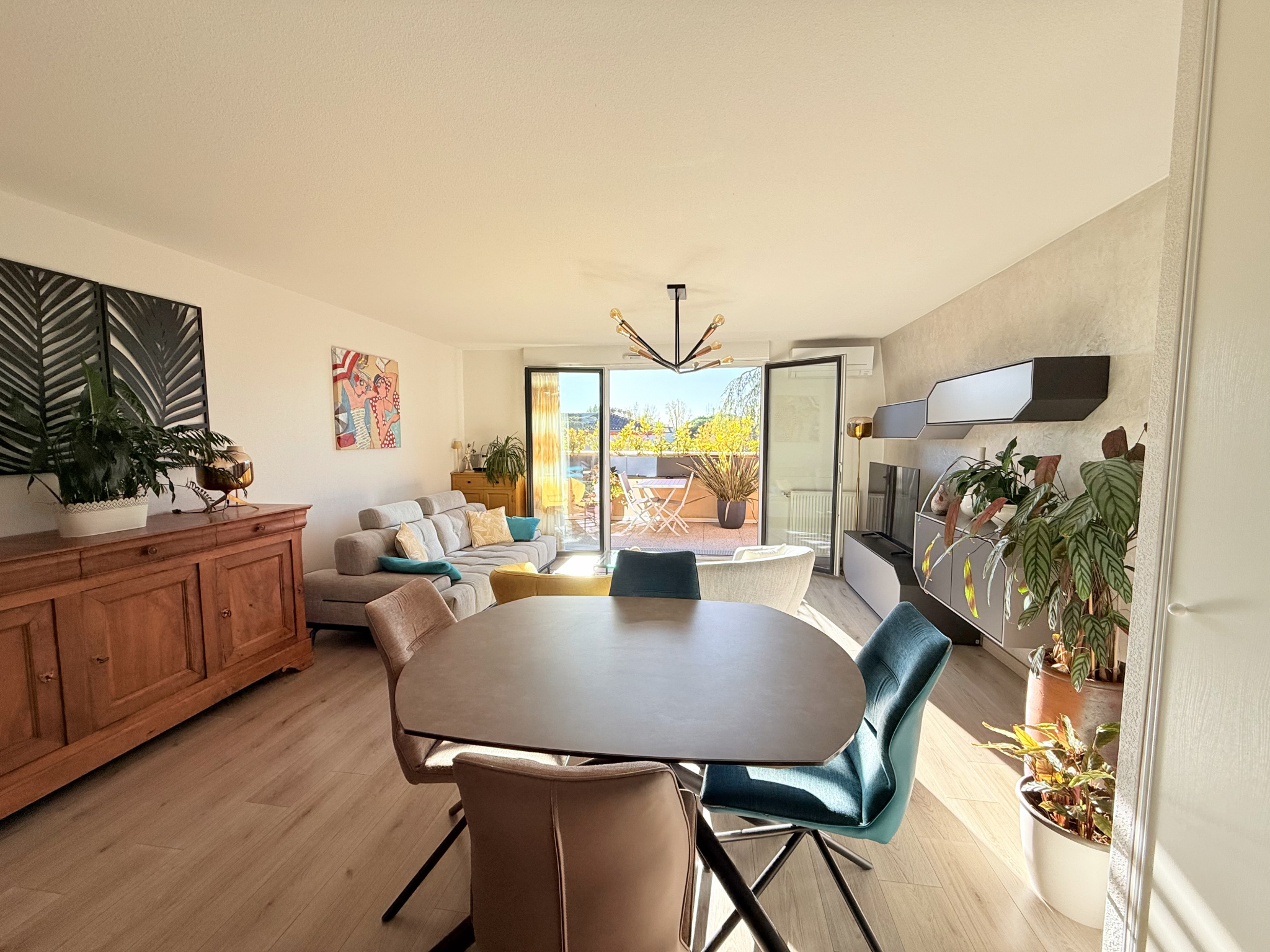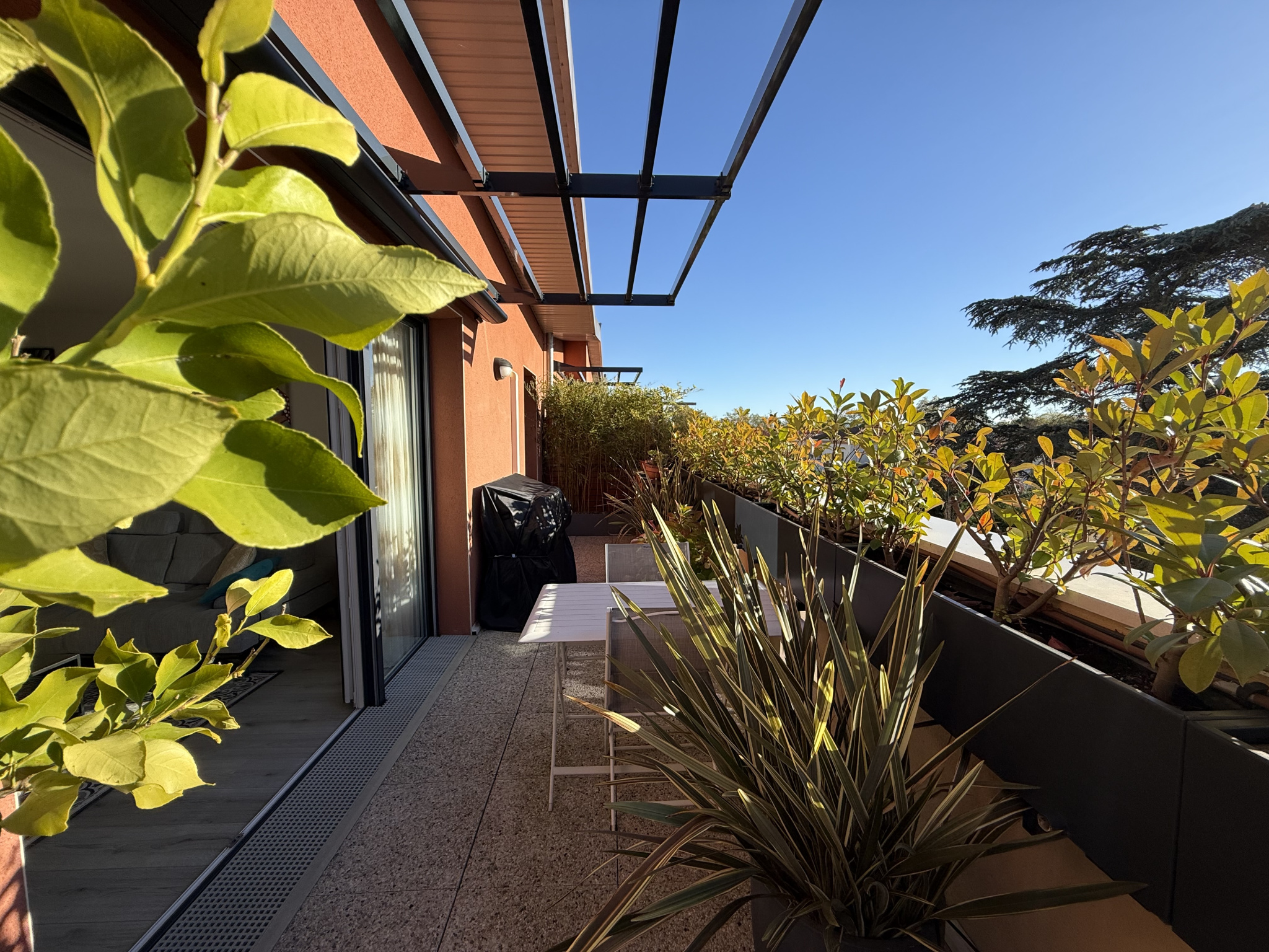 Passée l'entrée accueillante avec grand placard de rangement, cet appartement moderne et cosy offre une grande pièce de vie décorée avec goût, baignée de lumière avec sa large baie vitrée ouvrant sur deux magnifiques terrasses de 16 et 40 m2, lieu de détente au calme et sans aucun vis-à-vis, aménagé et agréable à vivre.