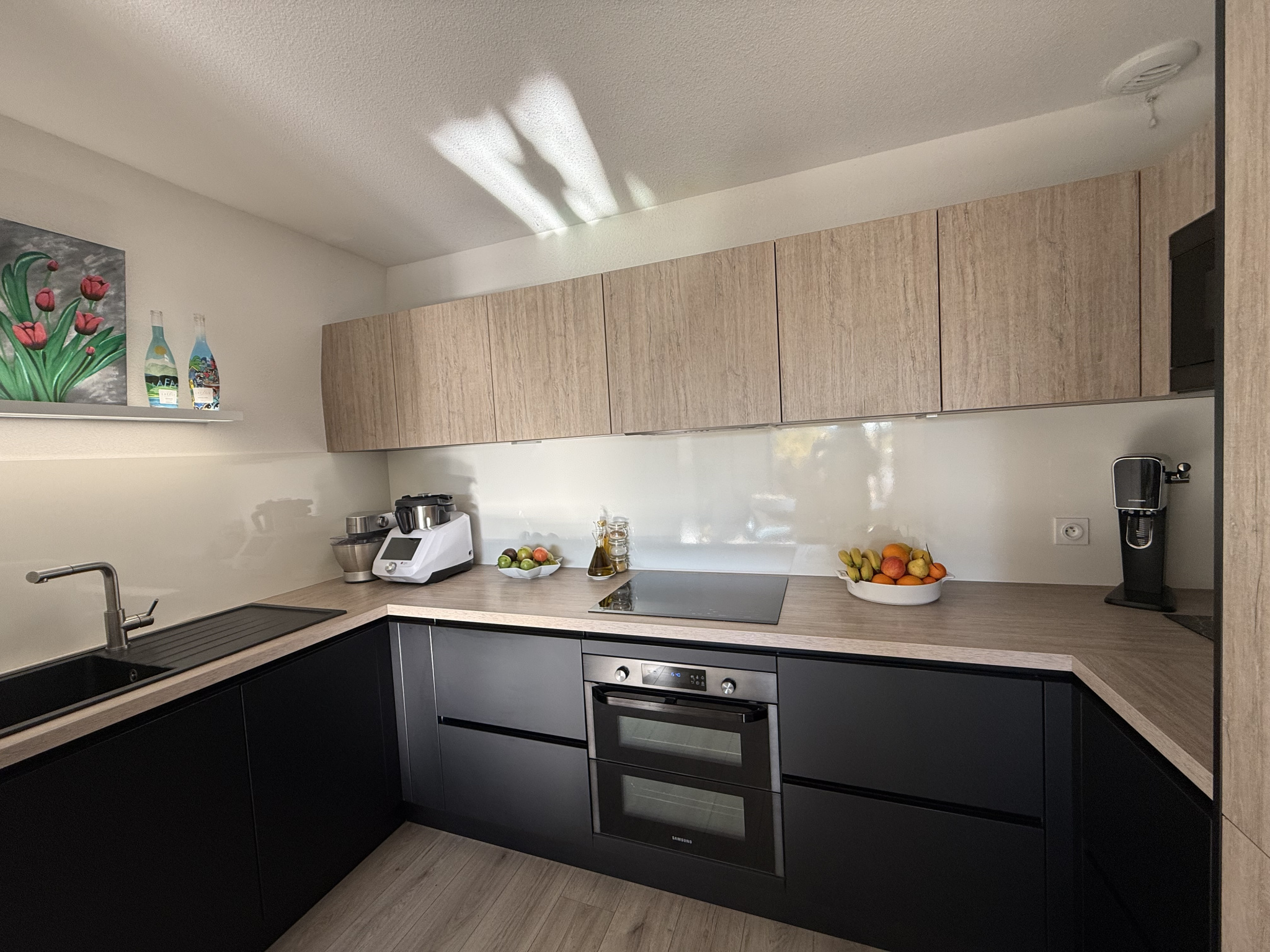 Une cuisine moderne entièrement équipée, dans l'esprit industriel noir et bois, permet de cuisiner de bons petits plats.