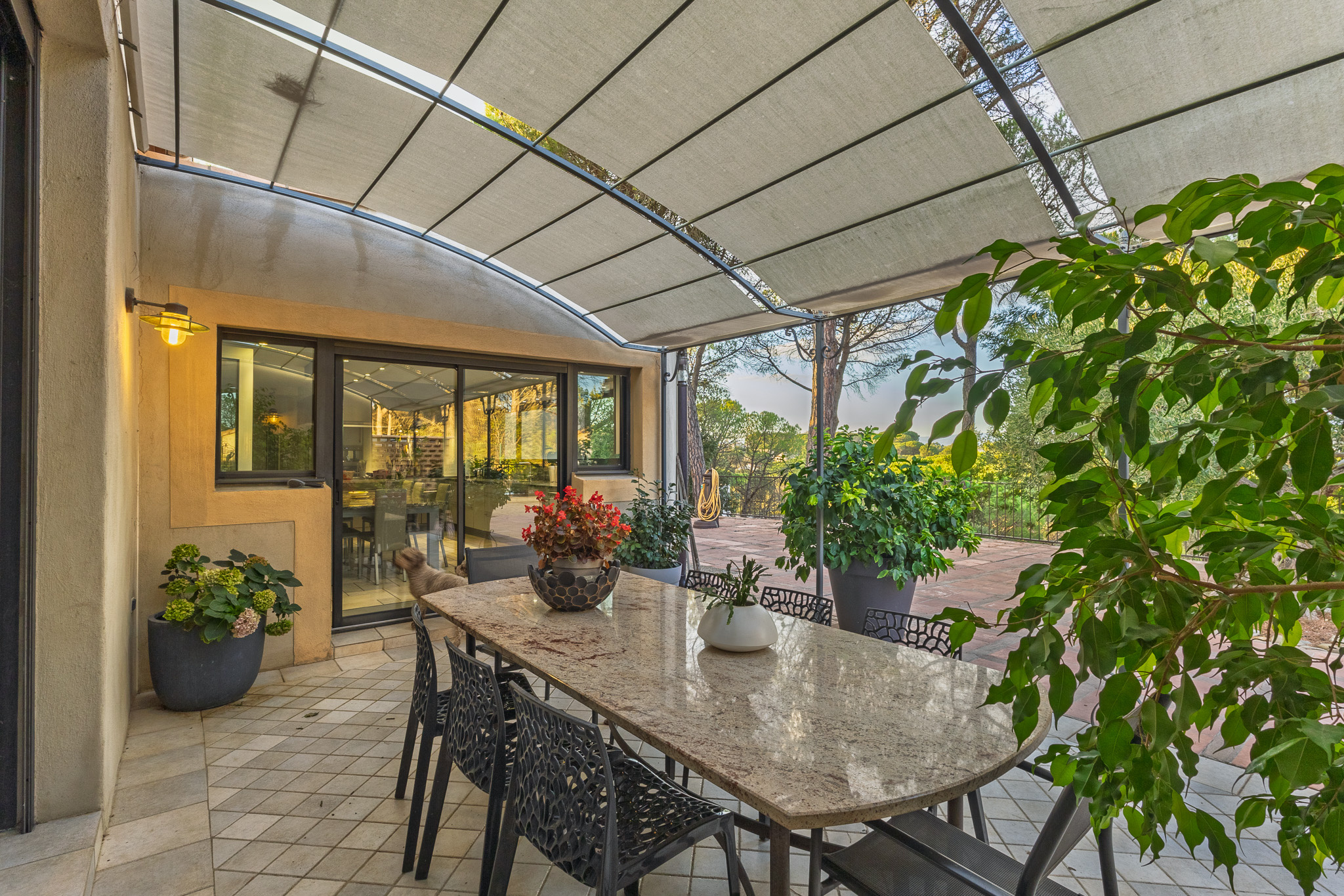 Le jardin, soigneusement aménagé, abrite de majestueux pins et un espace piscine discret. Un puits avec système d'irrigation automatique assure l'entretien du domaine tout au long de l'année.