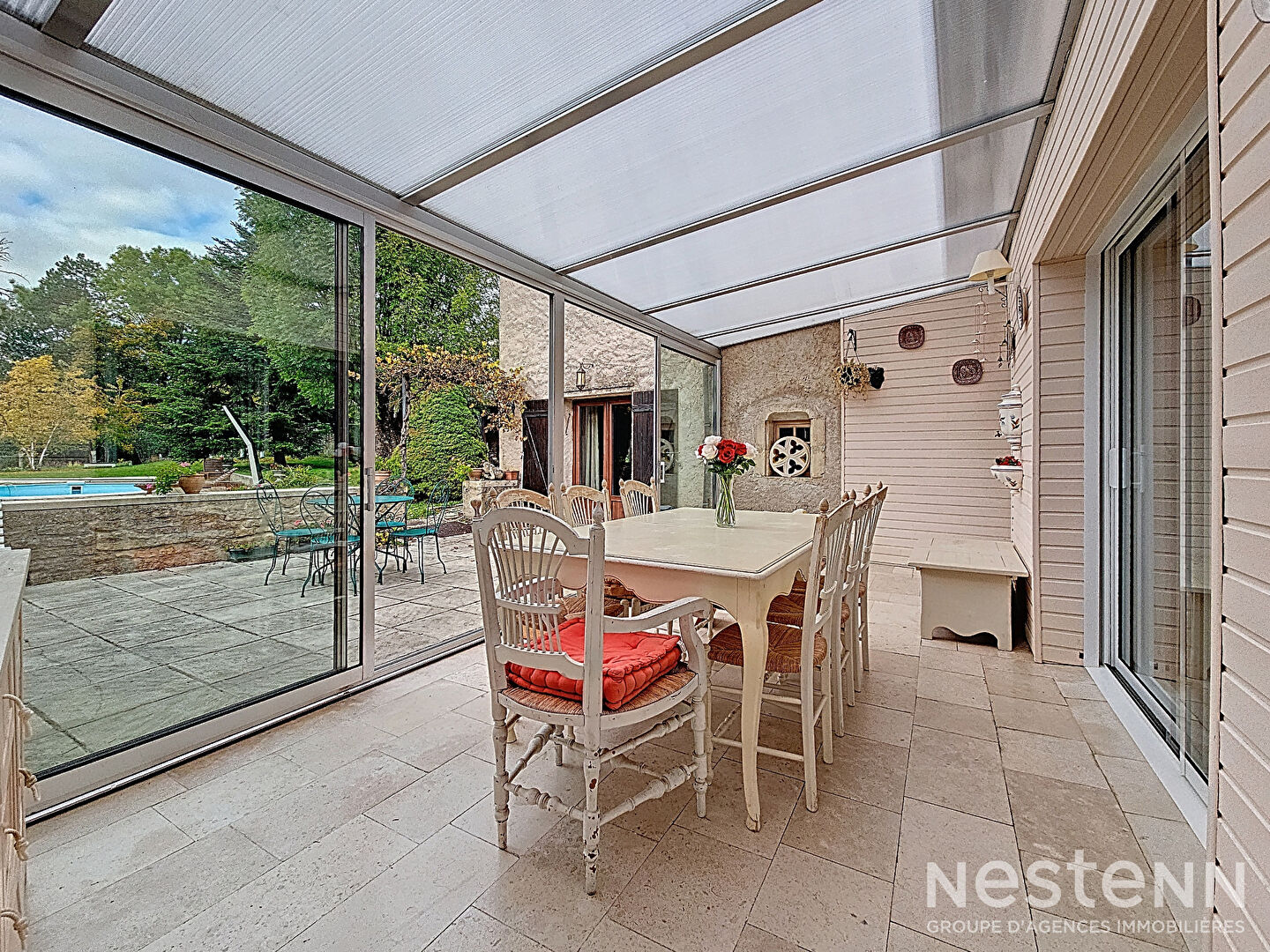 Le salon se prolonge sur une véranda chauffée de 20 m², véritable pièce de vie supplémentaire ouverte sur le jardin. S'ajoutent une cuisine équipée, une grande pièce de réception avec bar, une buanderie et un WC indépendant. La configuration permet de vivre de plain-pied.
