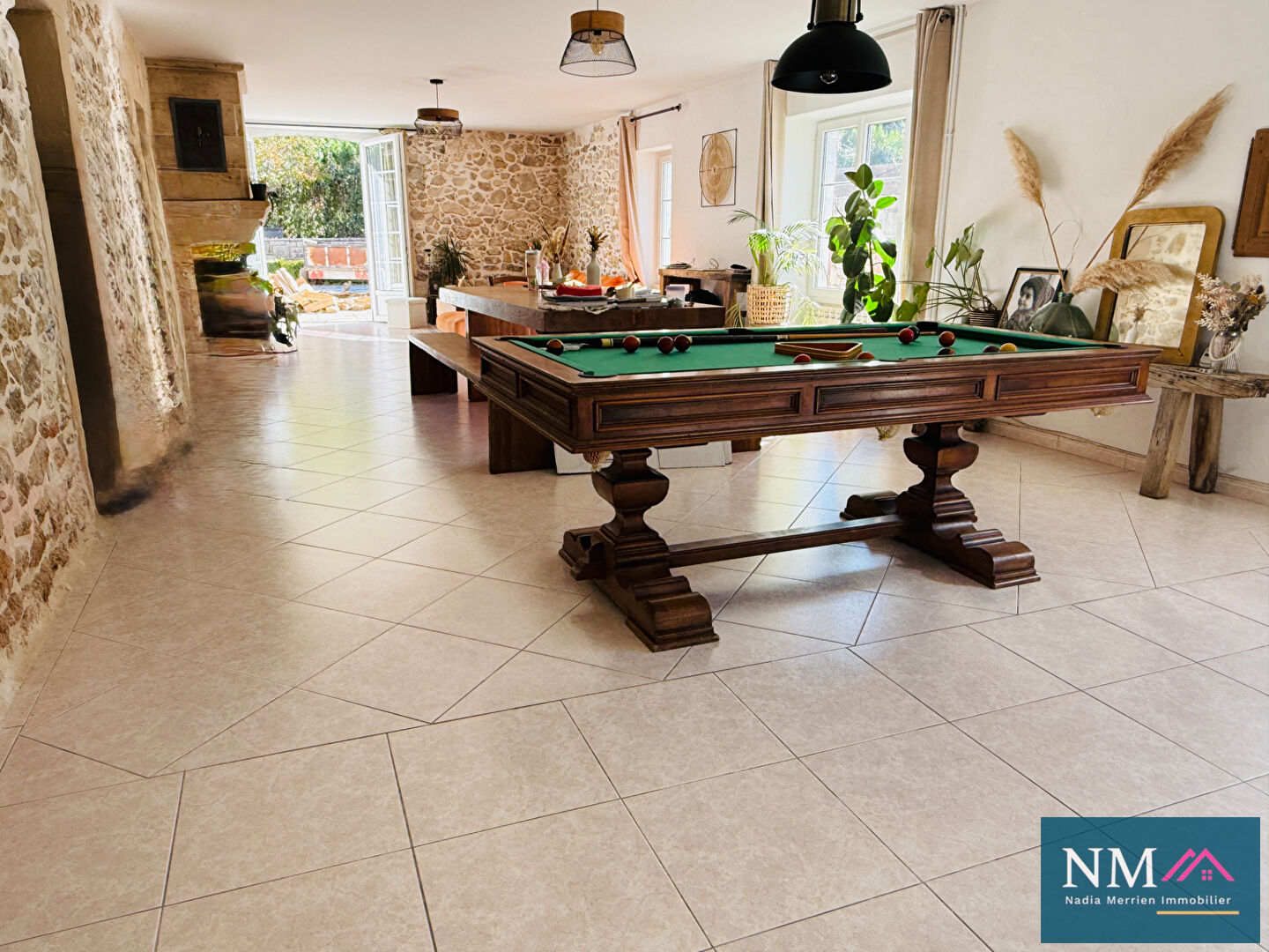 Au rez-de-chaussée, vous profiterez d'un vaste séjour de 60 m², baigné de lumière, avec pierres apparentes, cheminée et belle hauteur sous plafond.