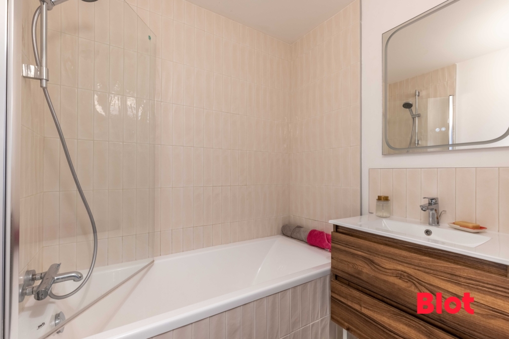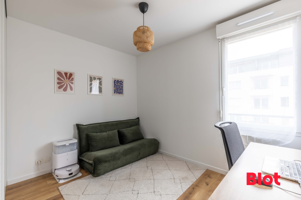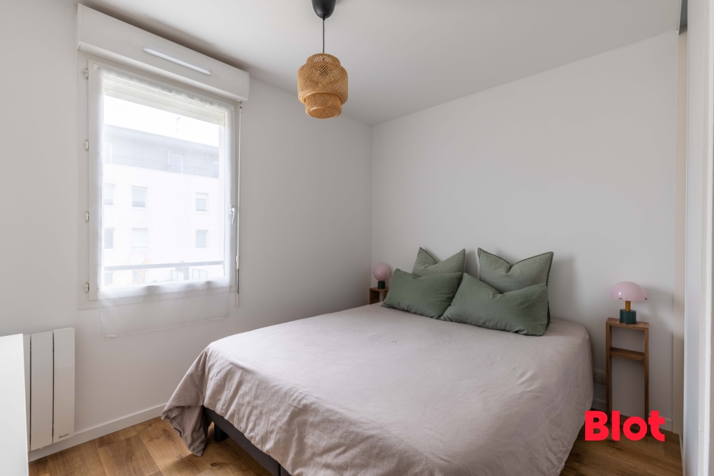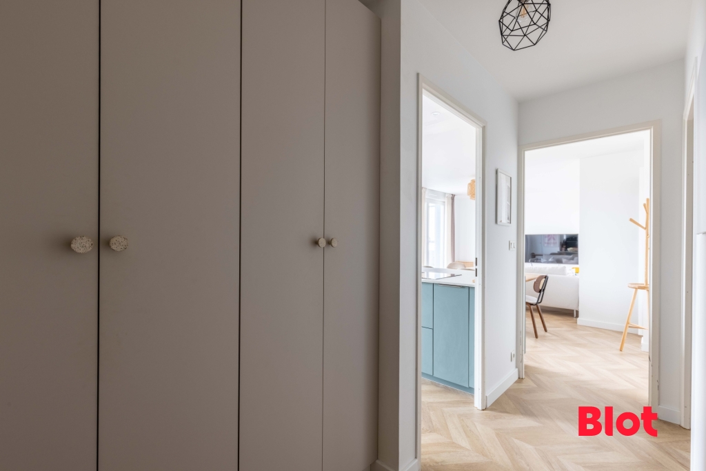 Il se compose d'une entrée avec placard menant sur un beau salon séjour lumineux et une cuisine contemporaine toute aménagée et équipée. Le couloir dessert deux belles chambres (avec chacune un placard intégré), une salle de bains et un WC.