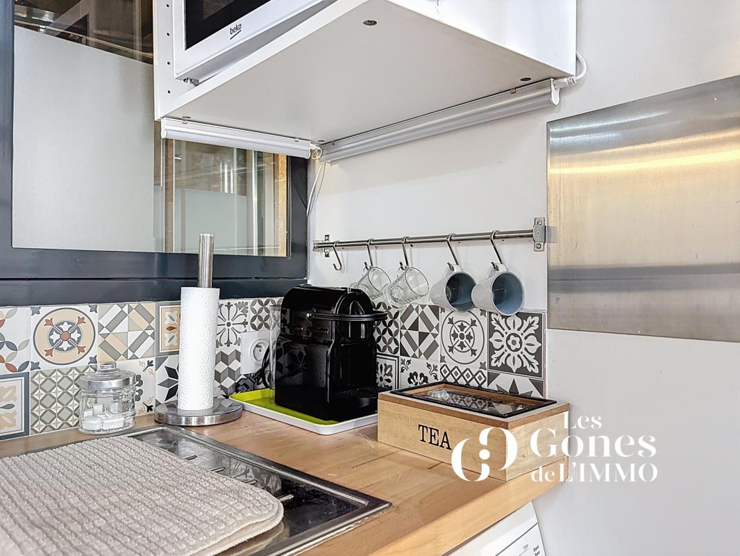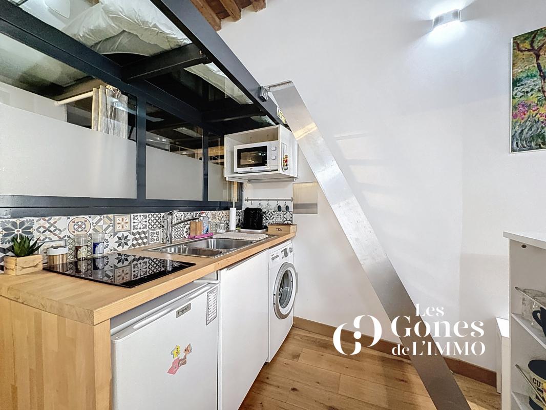 Une cuisine équipée élégante, un coin salon parfaitement défini, et un espace nuit en mezzanine apportent confort et fonctionnalité. L'ensemble dégage une atmosphère chaleureuse et raffinée.