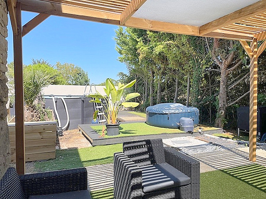 Un jardin clos avec piscine hors sol et terrasse et une dépendance à aménager.