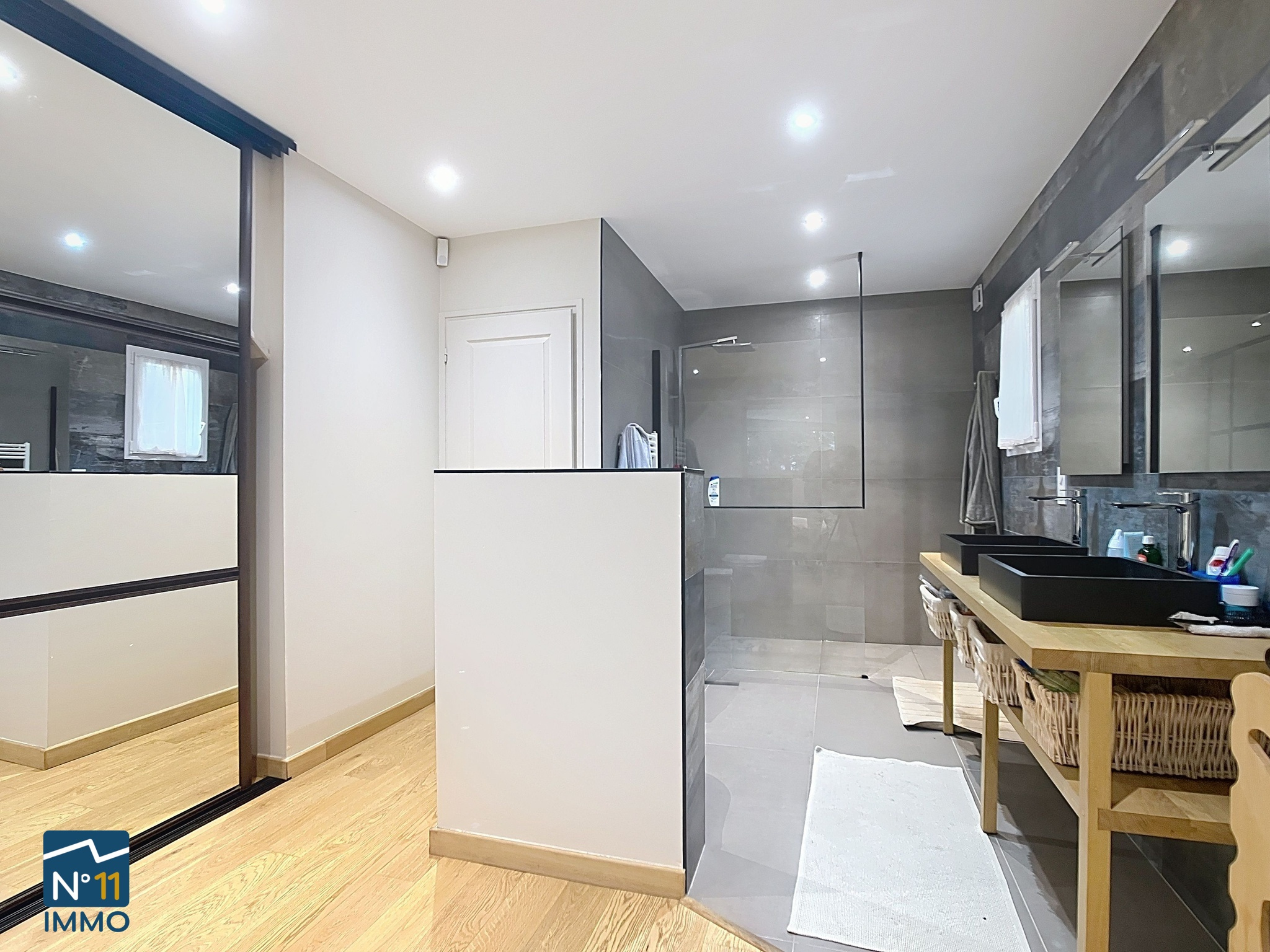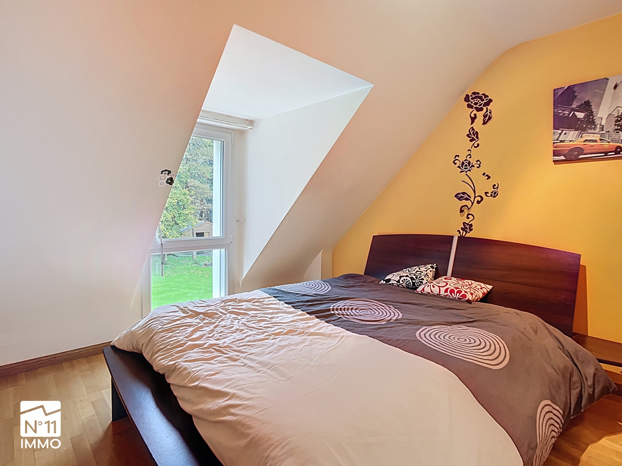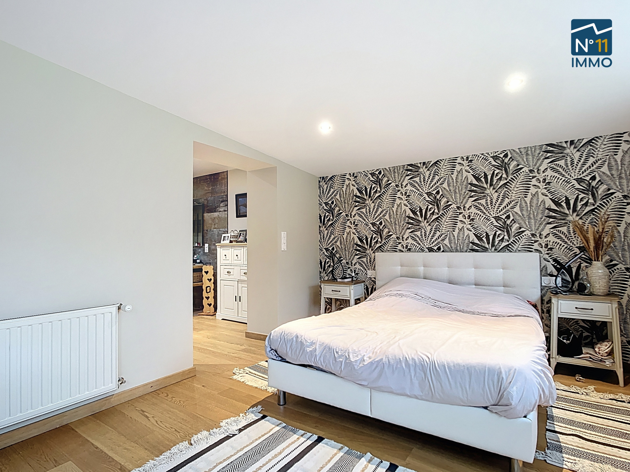 En rez-de-chaussée vous trouverez une pièce de vie lumineuse avec poêle à bois, une cuisine ouverte équipée, une buanderie, un garage, des w.c indépendants ainsi qu'une suite parentale dotée d'un dressing avec salle d'eau et w.c privatif.