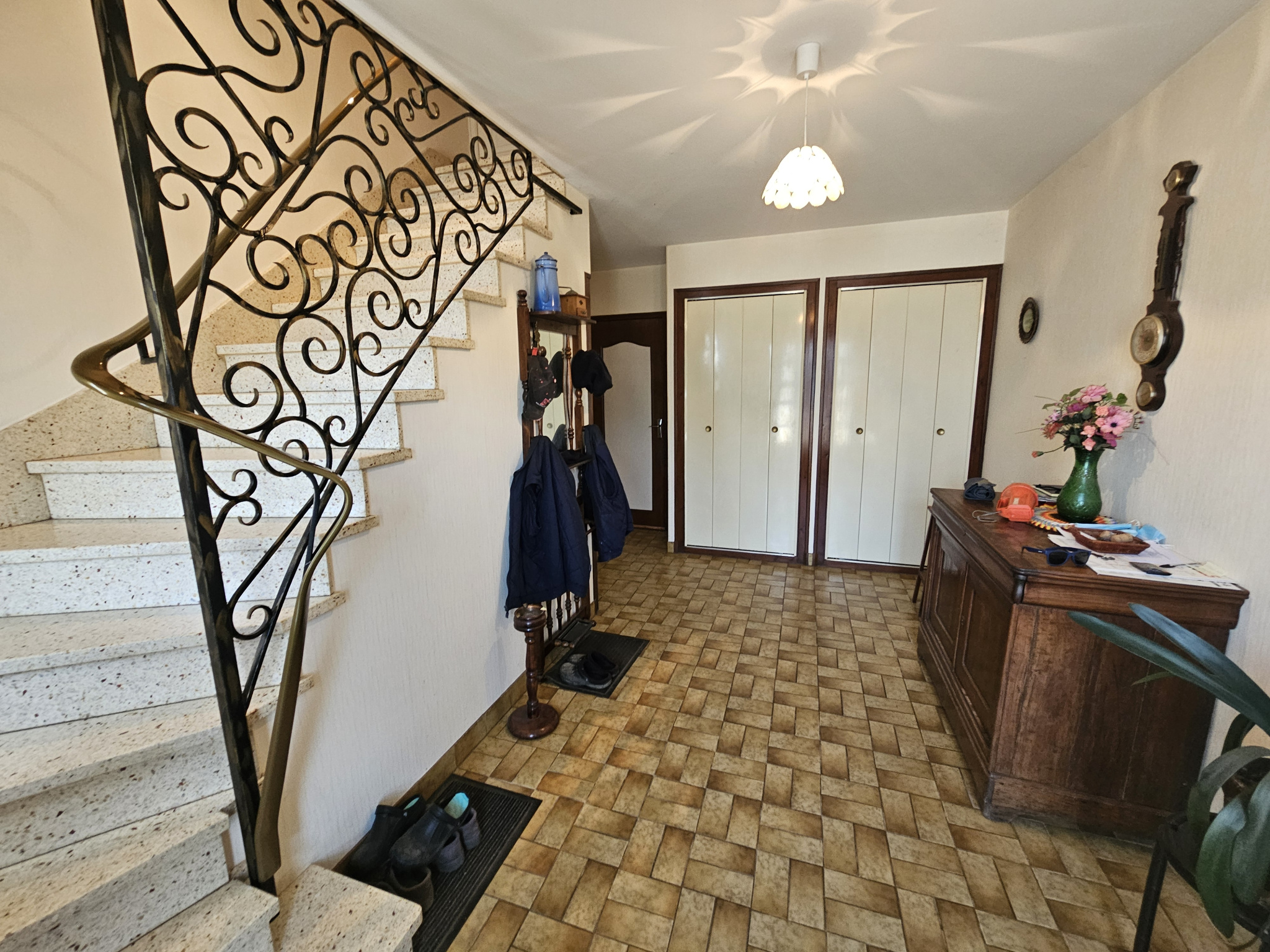 OPEN IMMOBILIER vous propose en exclusivité ce pavillon lumineux construit en 1982 à Saint-Léonard-de-Noblat 87400, élevé sur sous-sol et en très bon état général. Le sous-sol comprend une entrée avec rangement, une pièce avec point d'eau et WC, un garage pour deux voitures ainsi qu'une chaufferie/buanderie. À l'étage, la maison dispose d'une pièce de vie avec parquet mosaïque et accès balcon, d'une cuisine donnant aussi sur balcon, de trois chambres, d'une salle de bain, d'un WC séparé et d'un grand couloir avec placard. Grenier au-dessus avec charpente traditionnelle, sol parquet et isolé au plafond. Les fenêtres sont en bois double vitrage, la toiture en tuile est en bon état, et un conduit de cheminée est présent dans la cuisine. La maison nécessite un rafraîchissement intérieur et la mise aux normes de l'assainissement. Le terrain d'environ 1590 m2 est planté d'arbres fruitiers et comprend un garage supplémentaire ainsi qu'un atelier sur cave. La maison est spacieuse, saine et lumineuse avec une belle vue sur la campagne. À visiter rapidement !