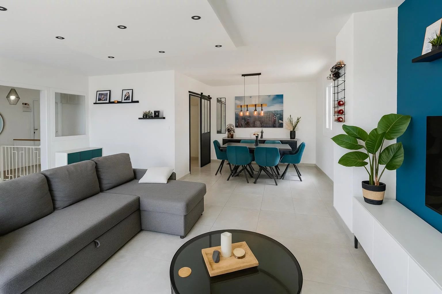 Composé au niveau supérieur d'un double séjour (possibilité 3ème chambre) sur grande terrasse ensoleillée, d'une cuisine équipée ouverte sur l'extérieur et d'une buanderie ainsi que