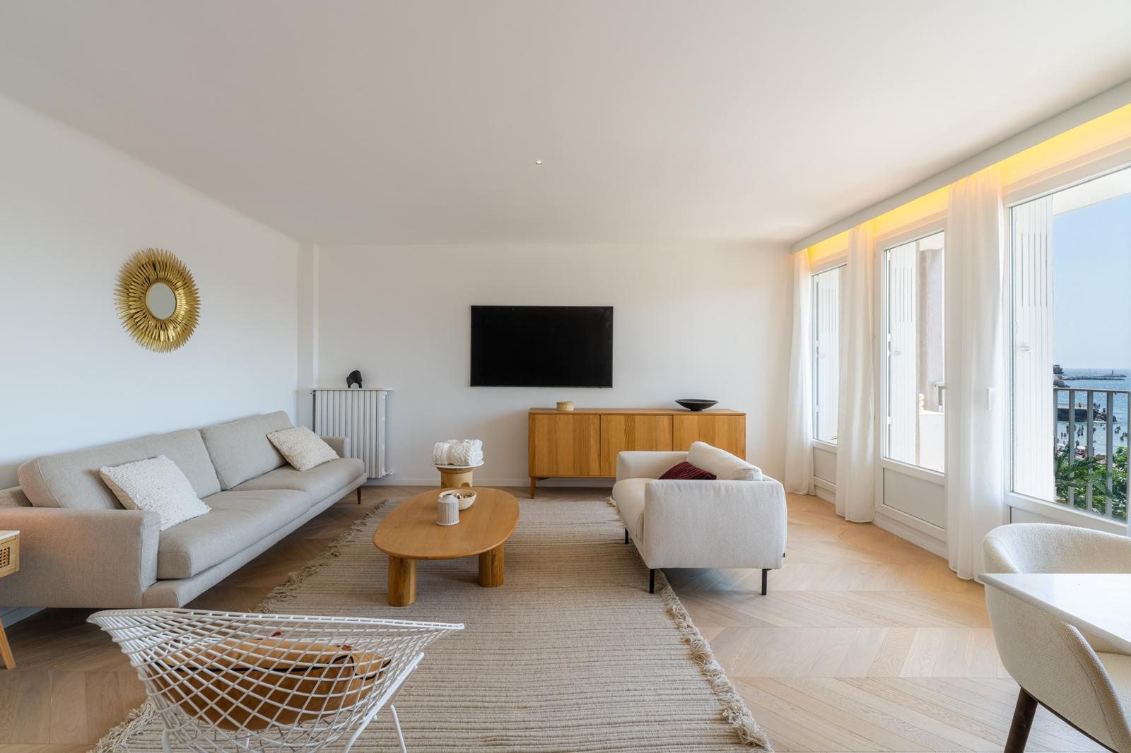 Face à la plage des Catalans, là où la mer rejoint la ville, s'ouvre un appartement d'exception de près de 80 m2, entièrement rénové, aménagé et équipé avec des matériaux choisis pour leur raffinement et leur qualité.