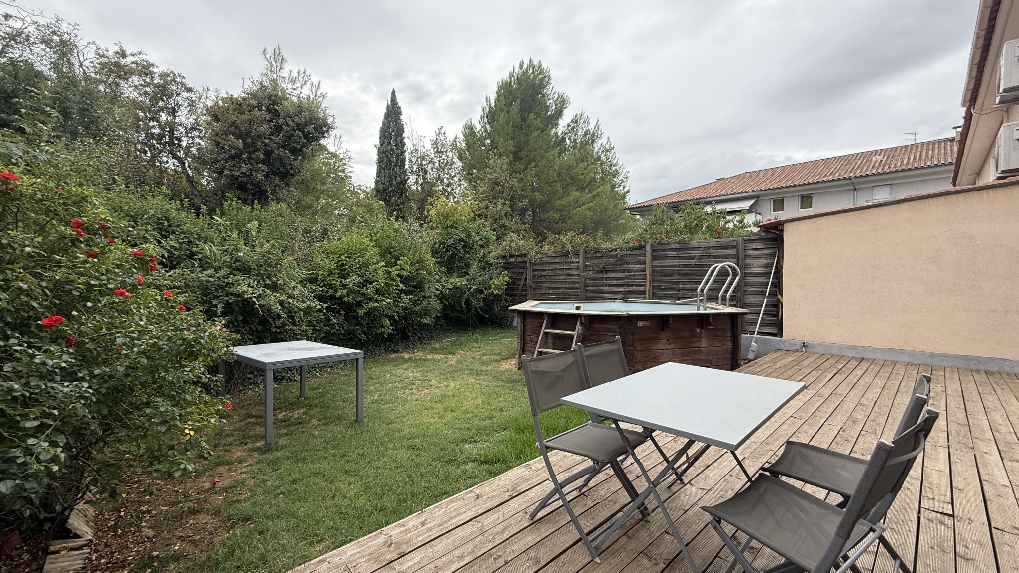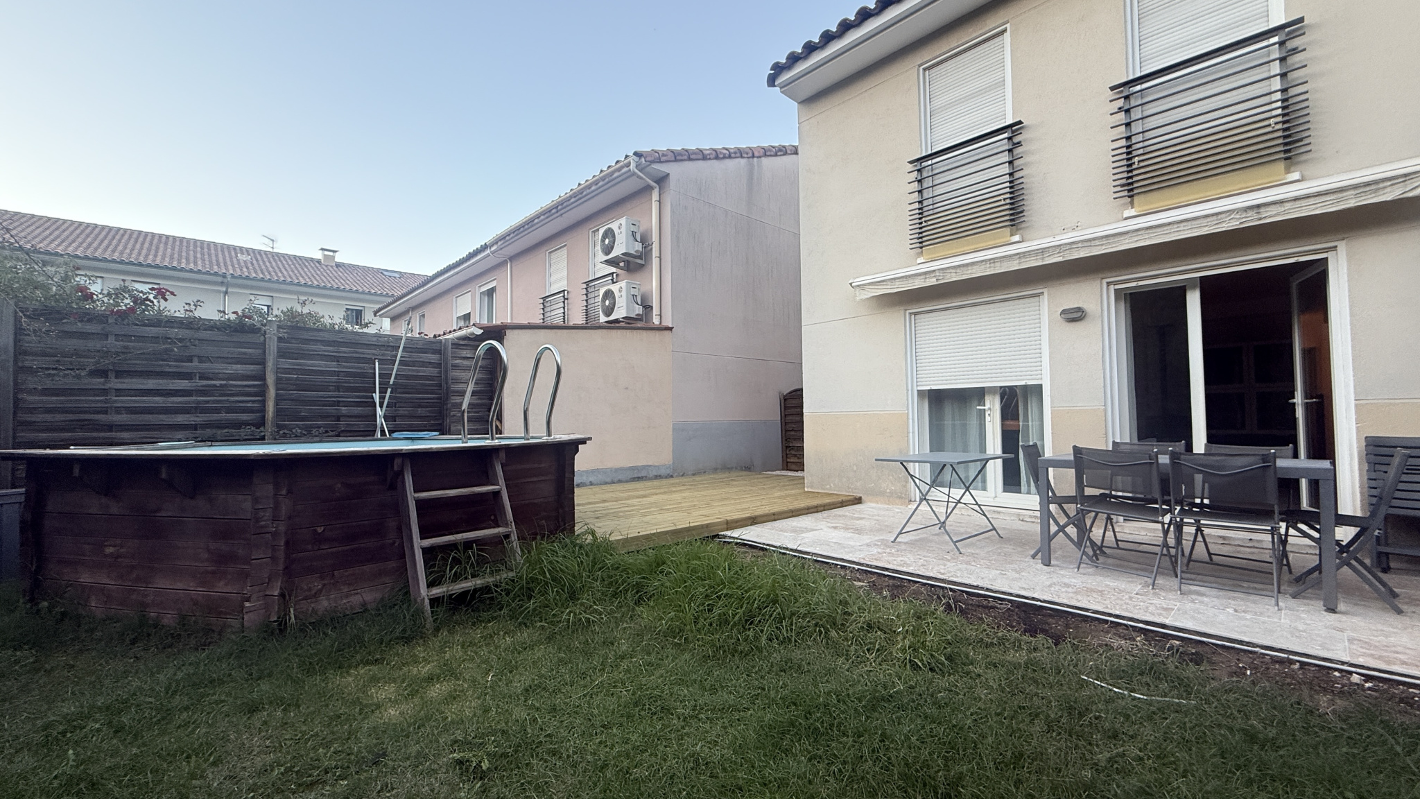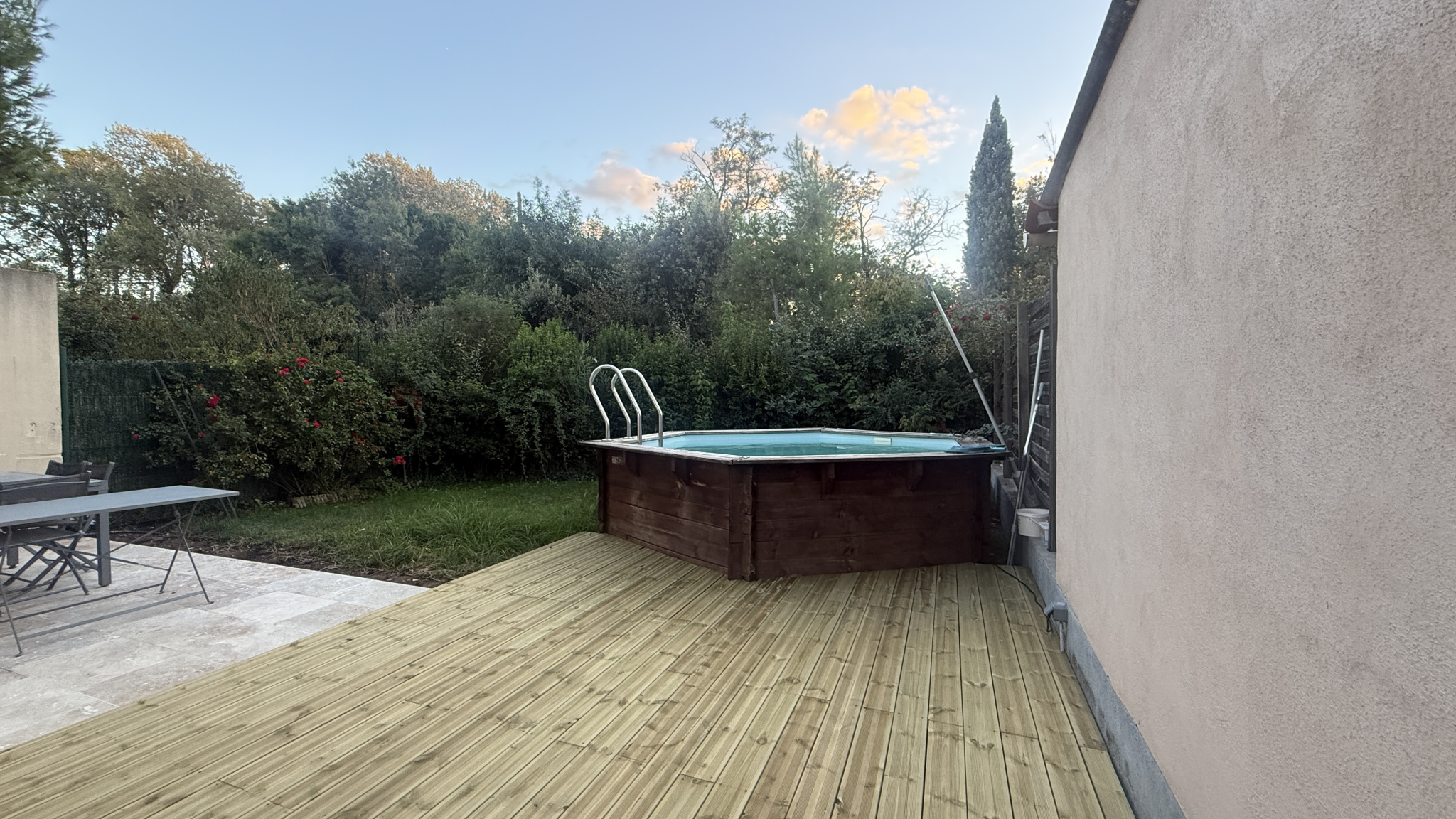 À vendre à Luynes à proximité de l'école internationale, cette charmante maison mitoyenne d'un côté offre une superficie de 90,90 m2, avec une piscine hors sol, un garage de 15 m2 et une place de parking privative. Elle se compose au rez-de-chaussée d'un salon/séjour lumineux de 30,52 m2, d'une cuisine aménagée et entièrement équipée de 12 m2, ainsi que d'un WC indépendant. À l'étage, vous trouverez deux chambres de 10 m2, une suite parentale de 15 m2, une salle de bains et un second WC. À l'exterieur, un jardin de 50 m2 avec terrasse en bois et une piscine hors sol. À proximité de l'IBS, Aix en Provence centre, est des axes autoroutiers pour Marseille. La maison est disponible dès à présent. DPE: C GES: A Coûts des annuels du logement: entre 890 EUR et 1260 EUR par an Alexandre PETRUCCI