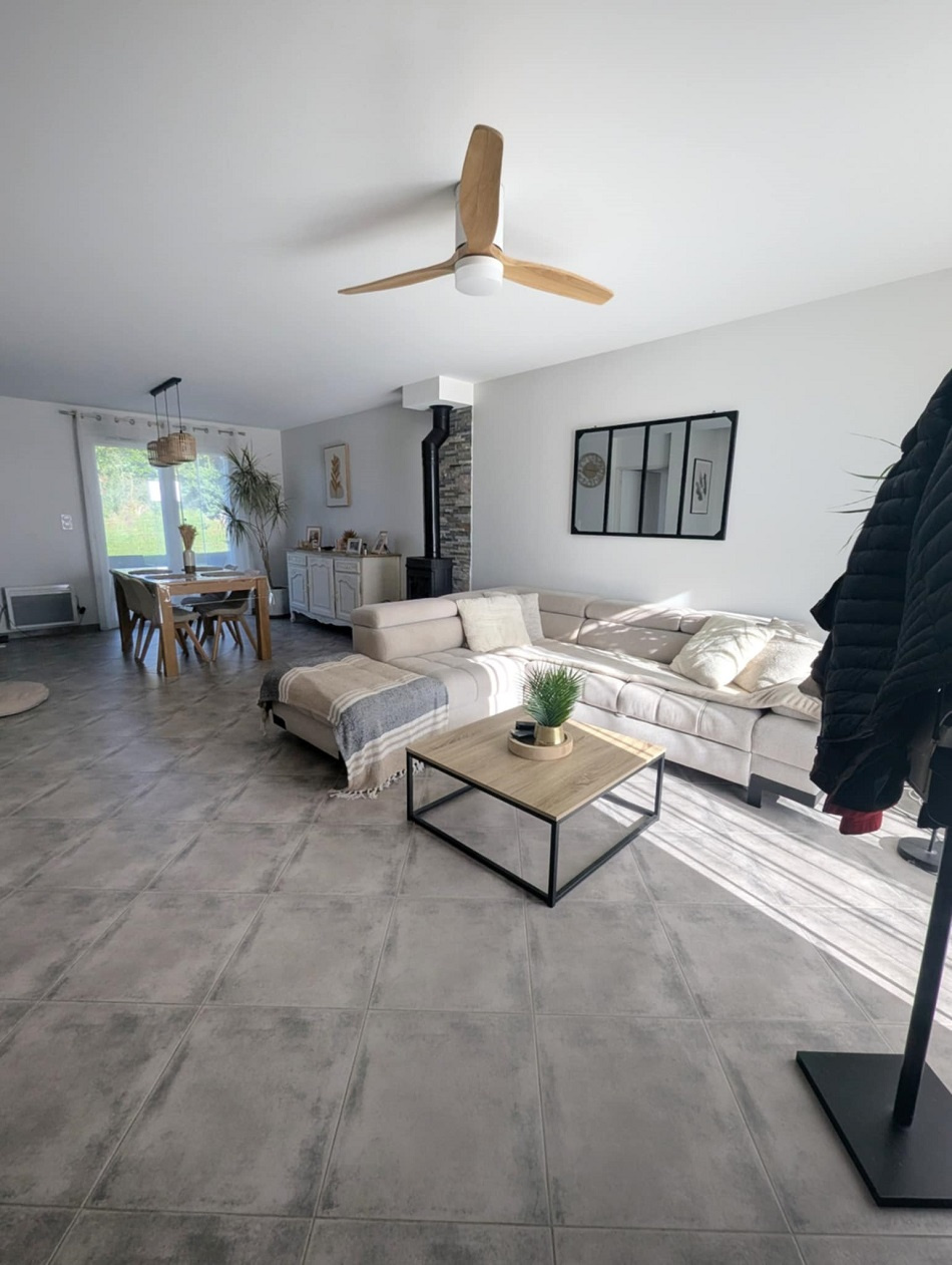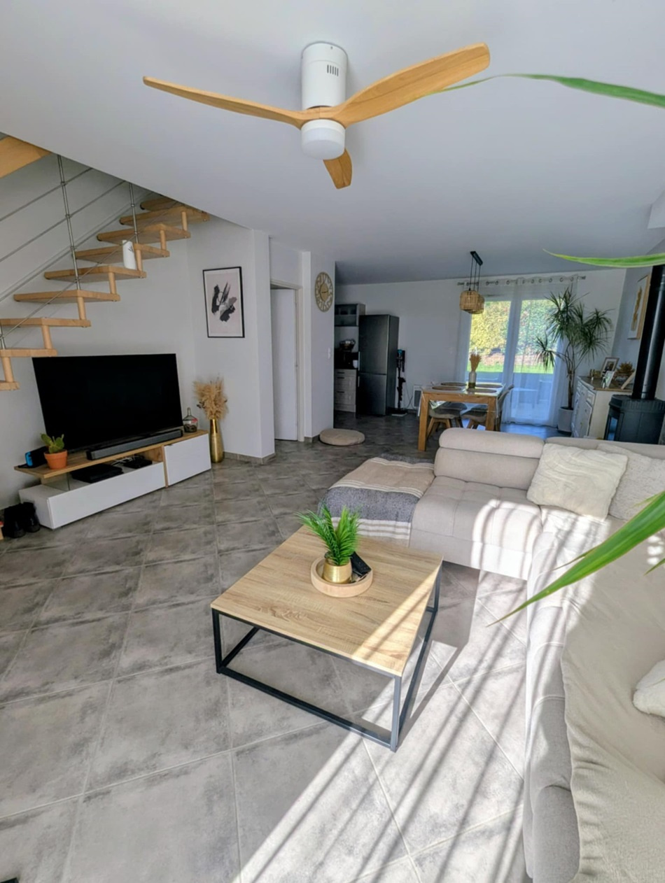 De plain-pied, vous trouverez une spacieuse pièce de vie lumineuse et traversante, offrant l'accès à 2 terrasses et son jardin, une cuisine ouverte vous permettant de préparer vos repas en toute convivialité, une chambre et un WC.