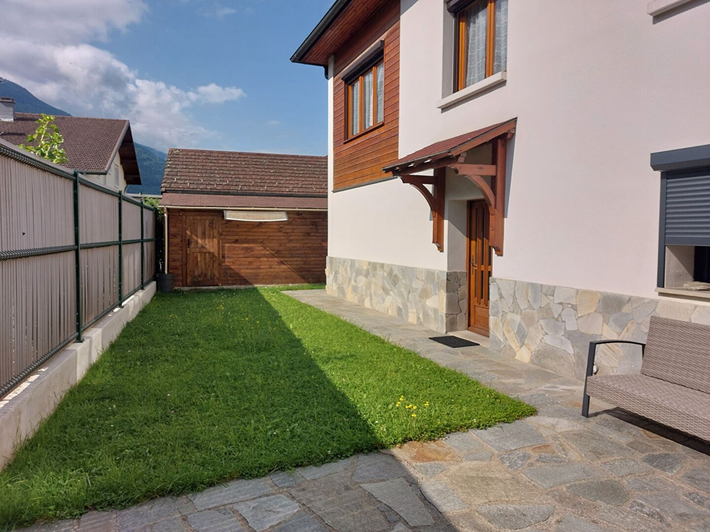 Au rez-de-chaussée, accessible par une entrée indépendante, se trouve un agréable T2 comprenant une cuisine équipée, un séjour lumineux ouvrant sur une grande terrasse, une chambre avec salle d'eau attenante ainsi qu'un WC séparé.