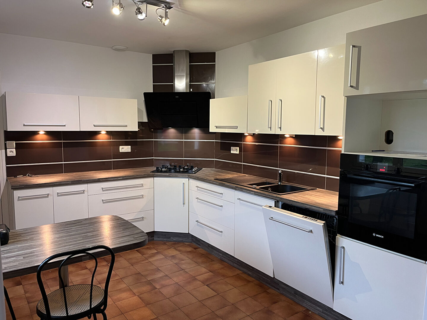 -Au rez-de-chaussée : une grande entrée, une belle cuisine aménagée/équipée (four, plaque de cuisson, hotte, lave-vaisselle), un salon séjour, une grande chambre de plus de 14m², une seconde chambres, une salle de bains, des sanitaires, grand couloir avec placards.