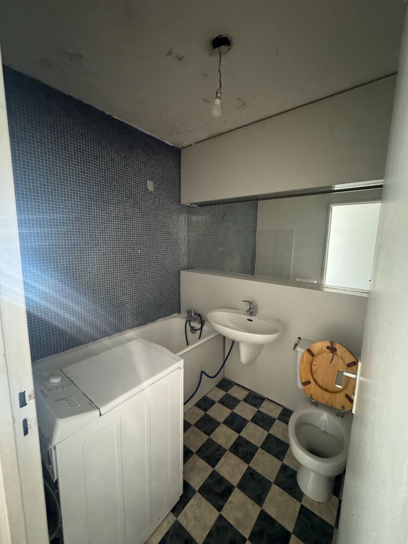Entrée, salle de bains avec WC de 3.45m². séjour avec coin kitchenette de 15.60m² et placard de rangement. Belle vue dégagée sur le quartier d'affaire et sur un espace vert aménagé récemment au pied de l'immeuble.