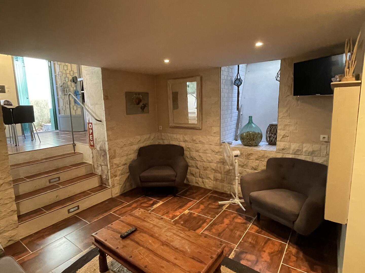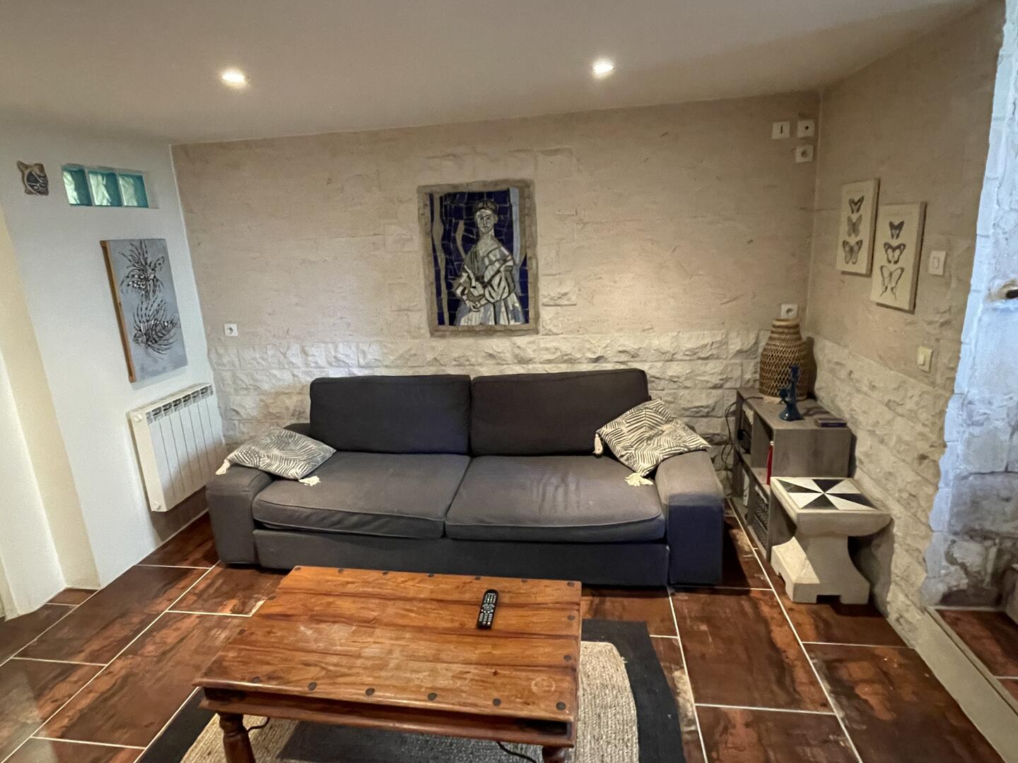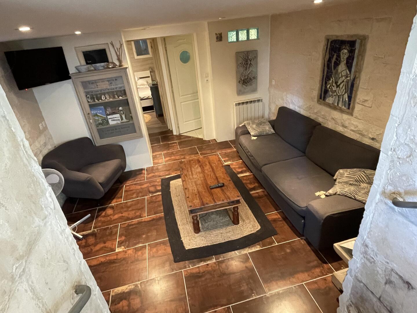 Salon, cuisine équipée avec espace repas, chambre, salle d'eau, wc et cave.
