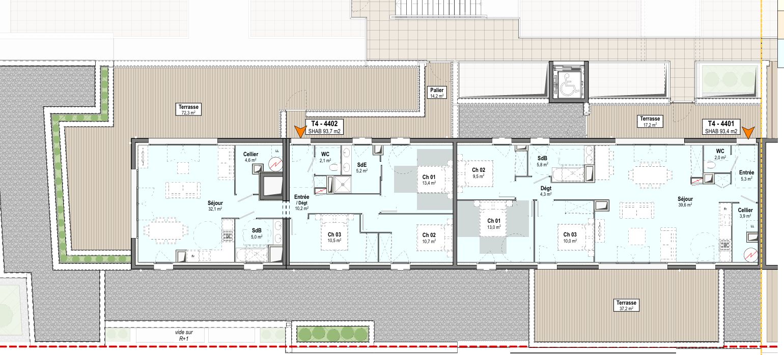 Les appartements, du T2 au T4, sont répartis sur 4 étages avec ascenseur et offrent un confort moderne répondant aux dernières normes RE2020 (seuil 2022).
