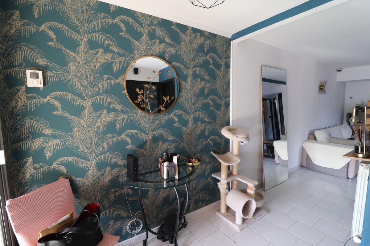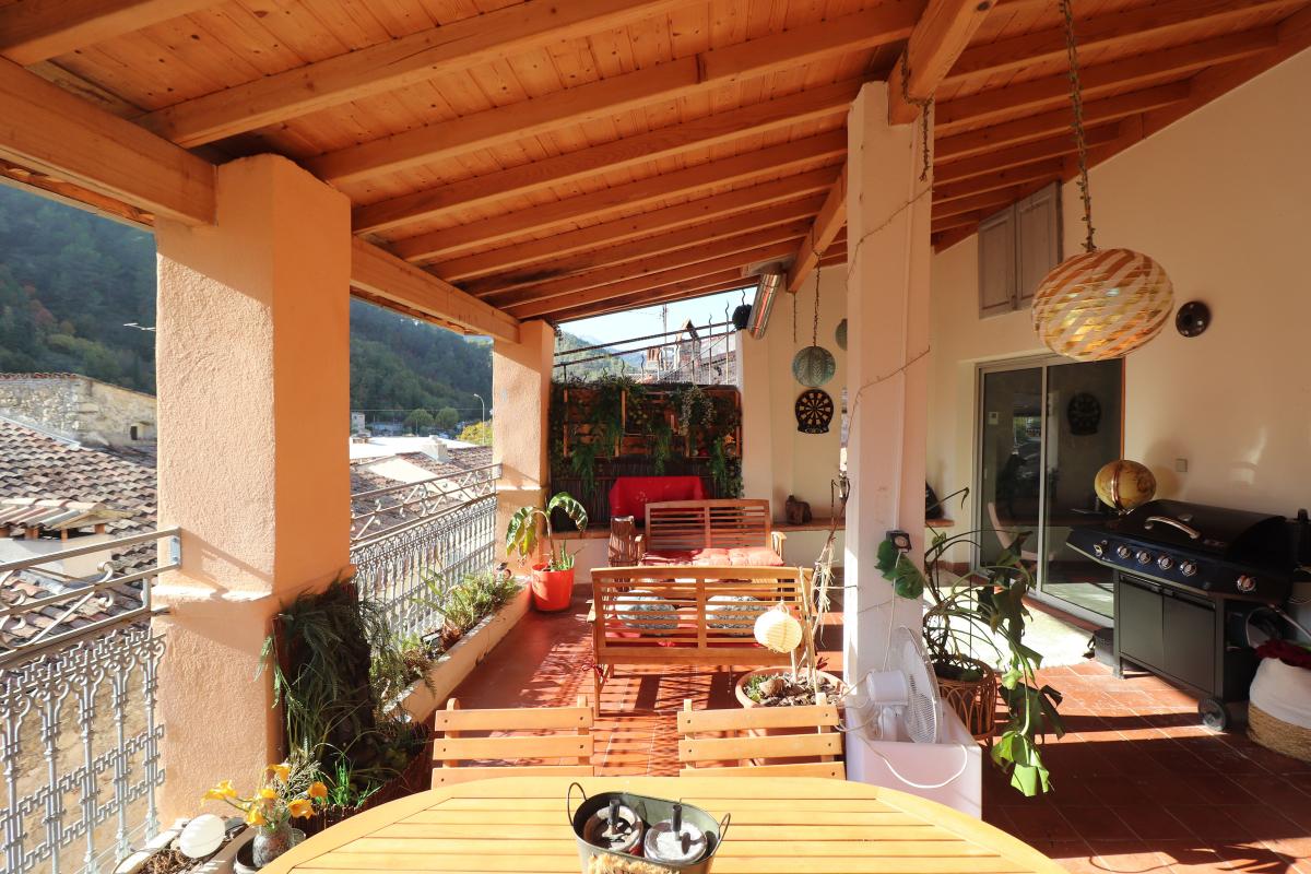 Appartement de type 3 pièces, seul dernier au étage. Il est composé d'une entrée, d'un séjour avec une cuisine ouverte aménagée, une salle de bains, un wc séparé, 2 chambres dont une avec un balcon et l 'atout principale est sa grande terrasse couverte de 27 m².