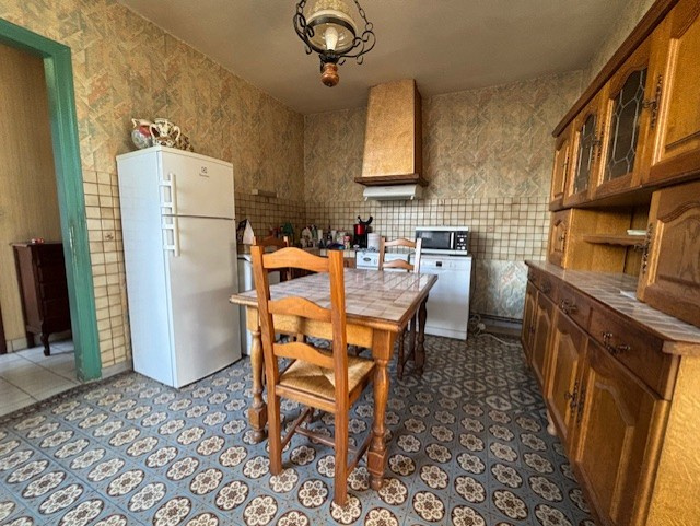 Au rez-de-chaussée vous découvrirez une cuisine, un salon séjour avec carreaux de ciment, placards d'origine et un insert bois, une salle d'eau et un wc indépendant.