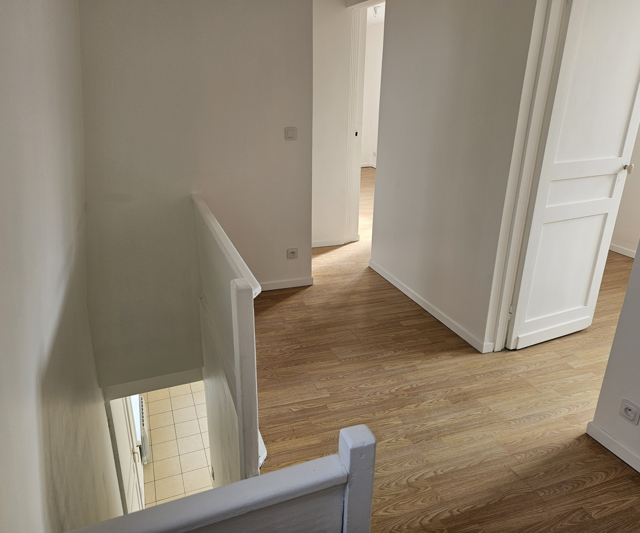 'En Exclusivité' Secteur Agence. Maison semi Individuelle à conforter en double distribution avec hall d'entrée, salon séjour avec poêle à pellet donnant sur une cour, grande cuisine de 12m2, salle de douche, wc, à l'étage on retrouve un grand palier et 3 chambres, comble de stockage. Travaux à prévoir et possibilité d'achat d'un garage en batterie à proximité.