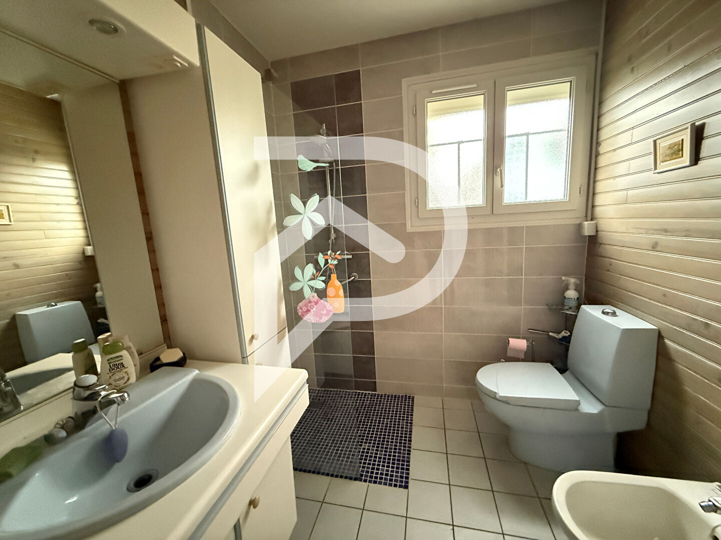 Cette maison à étage offre un bel espace de vie lumineux avec un double séjour de 27 m², une cuisine indépendante, une chambre de plain-pied avec salle d'eau et WC, ainsi qu'un cellier .