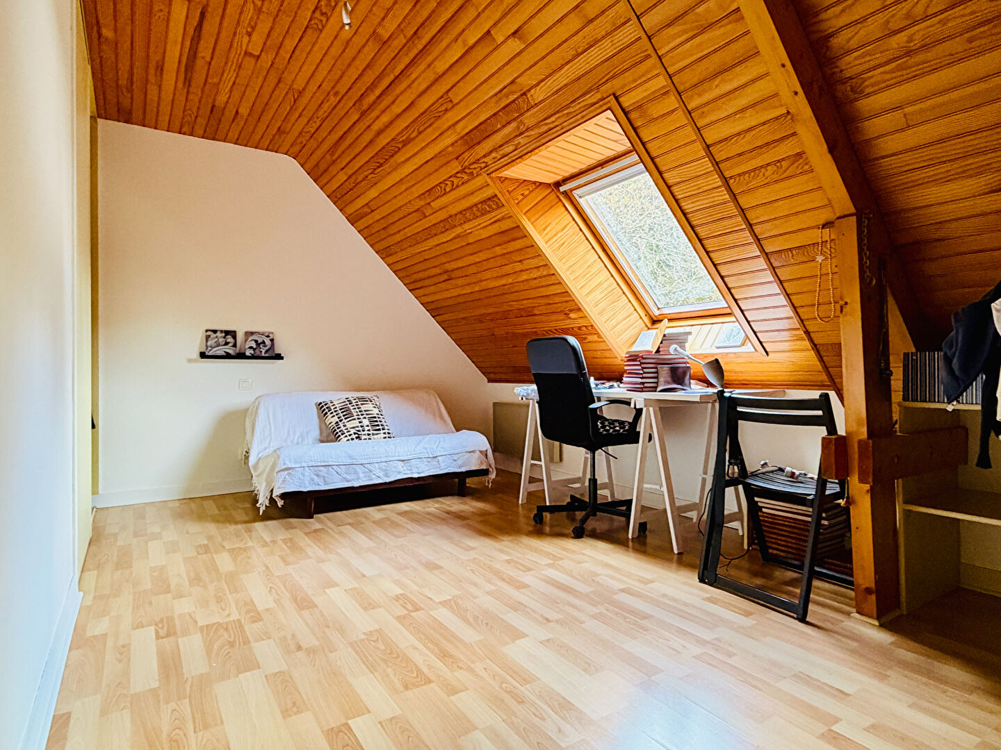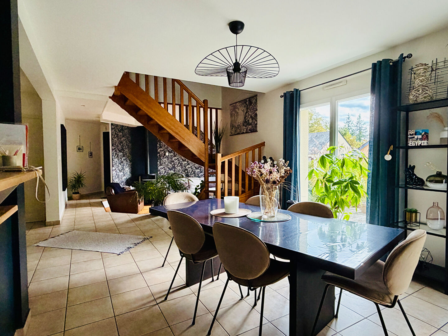 Nichée en lisière de forêt, cette maison indépendante offre un cadre de vie calme et intimiste, idéal pour les amoureux de nature et de tranquillité. D'une surface habitable d'environ 135 m², elle se distingue par un salon chaleureux sublimé par un parquet massif et un poêle à bois, créant une atmosphère conviviale et authentique dès l'entrée.