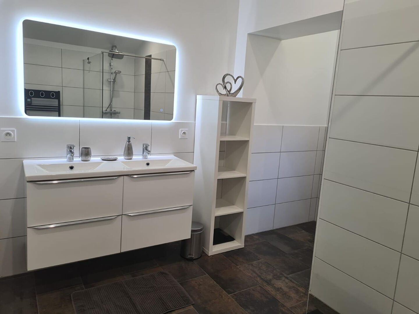 A l'étage, deux belles chambres de 10.71m² et 13.55m² avec dressing donnant sur un petit balcon à l'arrière de la maison. Une grande salle d'eau avec douche à l'italienne, double vasque et WC de 9.77m² complète l'étage.