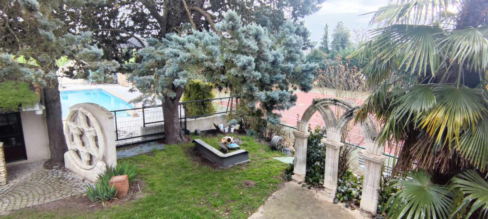 L'ensemble est accompagné d'un terrain clos de plus de 8 000 m² où l'on peut retrouver un terrain de tennis, une piscine de 12mx6m sonorisée ainsi qu'un étang et quelques caves troglodytes.