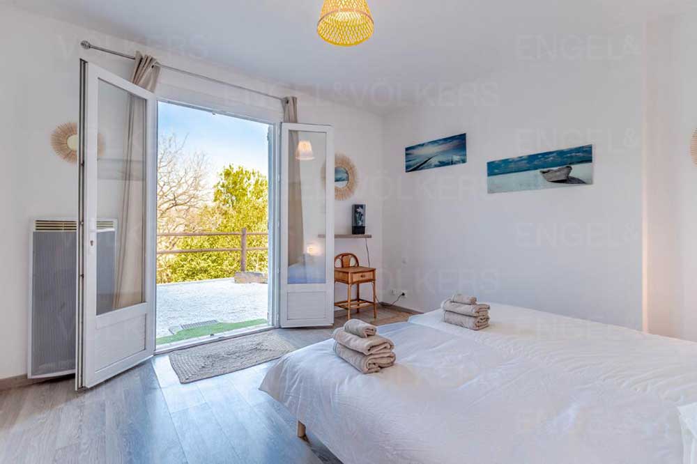 En descendant quelques marches, vous découvrirez trois chambres et profiterez d'une seconde terrasse de 60 m² offrant une vue imprenable sur la verdure environnante. La maison dispose également d'une salle de bain, de toilettes séparées et d'une cave pouvant être aménagée selon vos envies.