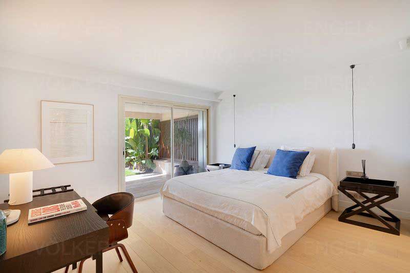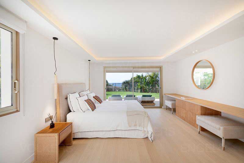 La villa, orientée plein sud, offre une surface d'environ 315 m². Récemment rénovée, elle allie confort et modernité. Elle dispose d'une grande cuisine équipée, d'un vaste séjour, de quatre chambres en suite, ainsi que d'une salle de sport. Le jardin privé avec jacuzzi offre une vue dégagée sur la mer, les îles de Lérins et le Palm Beach. Le séjour s'ouvre sur une grande terrasse avec vue sur la mer.