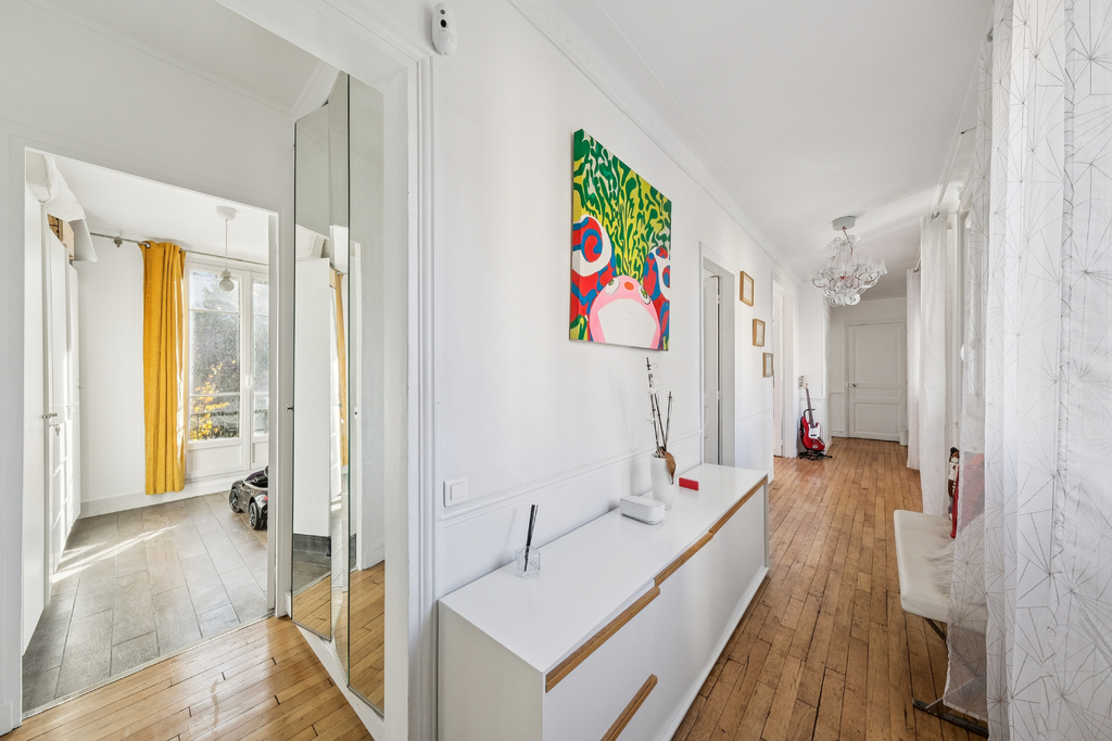 Le parquet d'origine ajoute une charme, tandis que l'agencement ouvert et lumineux crée une sensation d'espace et de fluidité.