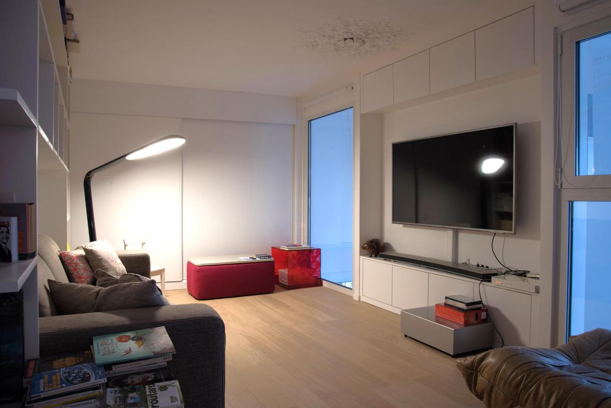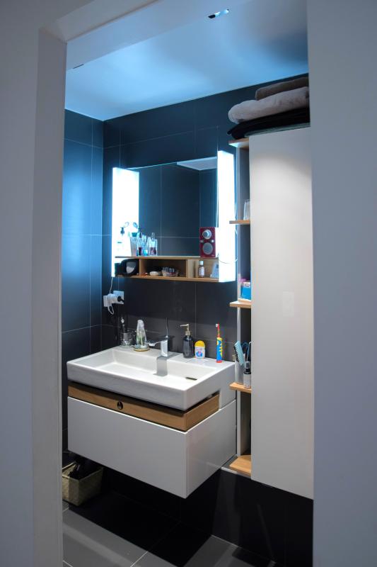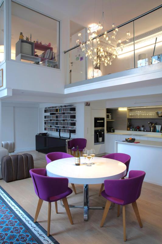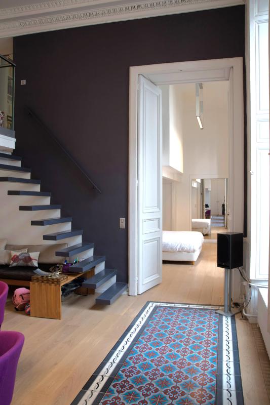 Ce grand duplex présente un premier niveau de 2 pièces spacieuses, dont la première constitue le salon ouvert sur une cuisine américaine équipée, et la deuxième consiste en une grande chambre parentale avec salle de bains et buanderie attenante. Par un escalier discret, on accède, depuis le salon, au niveau supérieur de ce duplex. Ce niveau est composé de 2 pièces fermées (chambres ou bureaux, selon le souhait) et d'un espace ouvert menant à une deuxième salle de bains. Beaucoup de rangements sont aménagés à chaque étage. Quoiqu'orienté au Nord, l'intérieur est lumineux car éclairé par 5 fenêtres majestueuses qui occupent l'intégralité des 5 mètres de hauteur sous plafond.