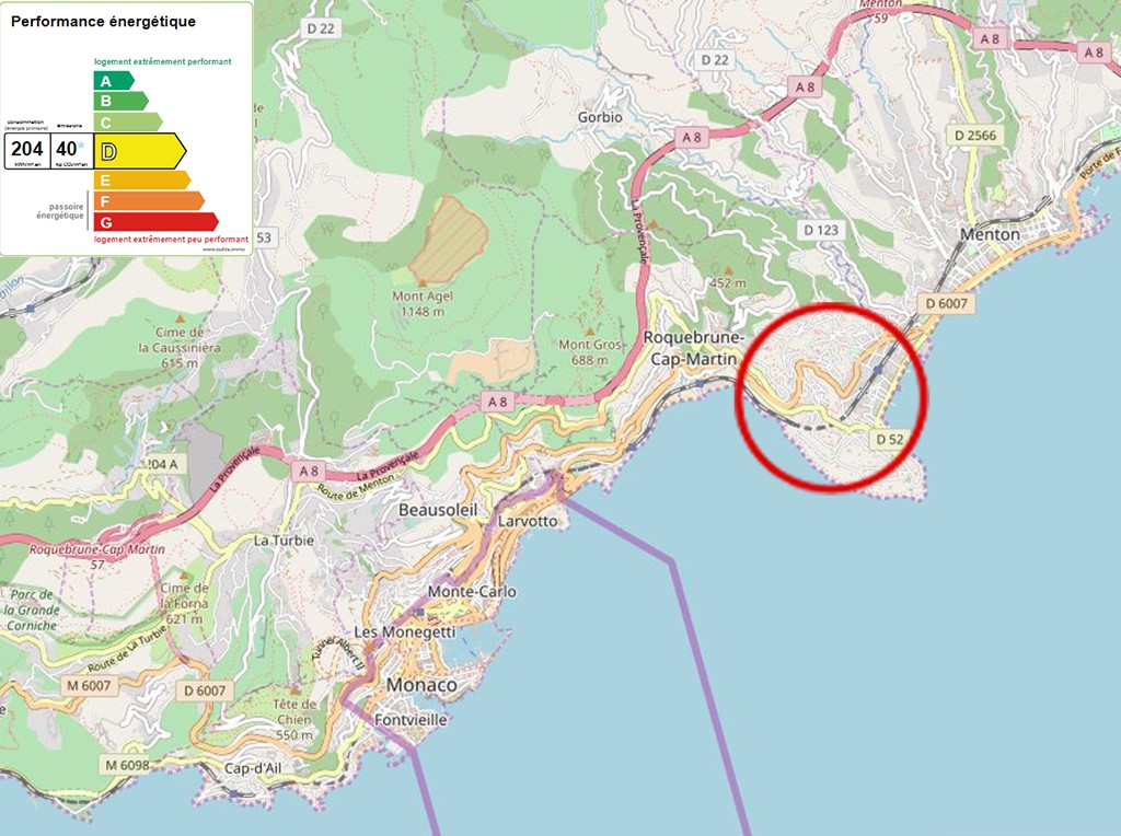 Roquebrune-Cap-Martin bénéficie d'une situation géographique privilégiée sur la Côte d'Azur, située à l'entrée de Monaco et à seulement 10 minutes de l'Italie et à environ 40 minutes de Nice. Roquebrune-Cap-Martin est une station balnéaire très attractive grâce à son climat méditerranéen et ses paysages des rochers s'élevant à 500 m au-dessus des plages et des baies paisibles.