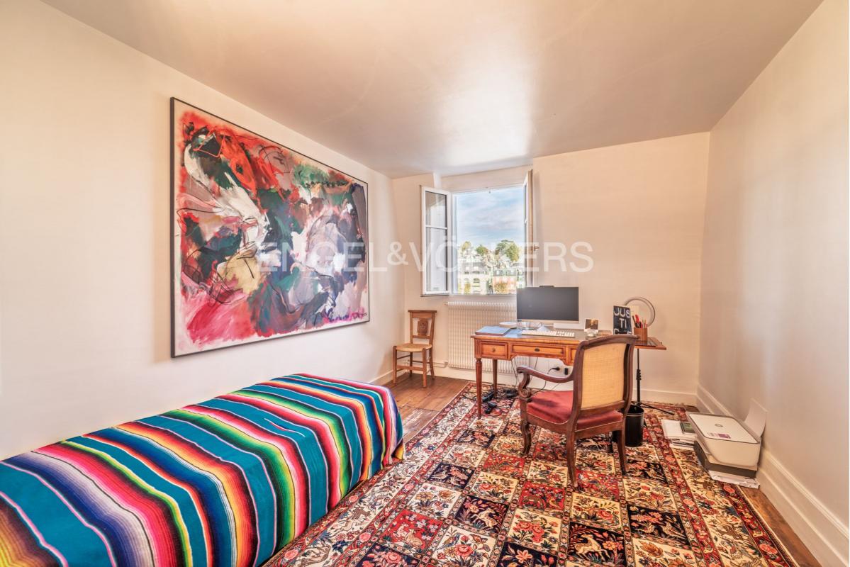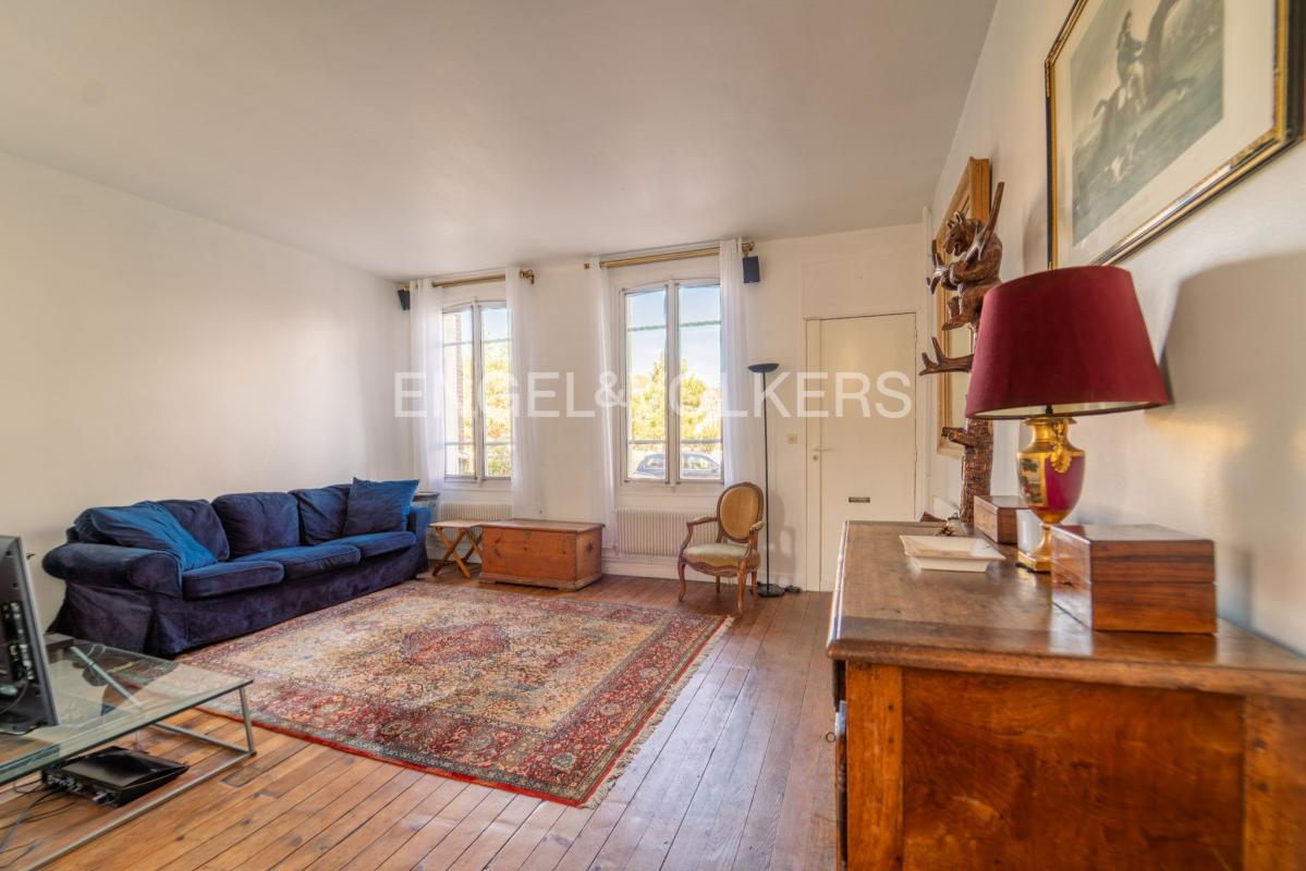 Une spacieuse pièce de vie traversante avec parquet ancien et belle hauteur sous plafond.