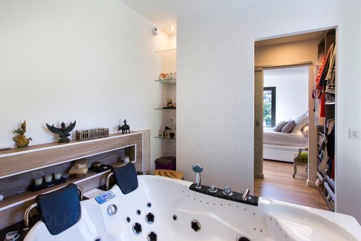 A l'abri des regards, en position dominante avec une vue dégagée sur la baie de Golfe-Juan, propriété contemporaine de 370m² environ, édifiée sur un terrain clos de 2000m² doté d'un jardin arboré avec piscine chauffée sans aucun vis-à-vis et son vaste pool house de 70m² avec salon, cuisine d'été et salle d'eau.