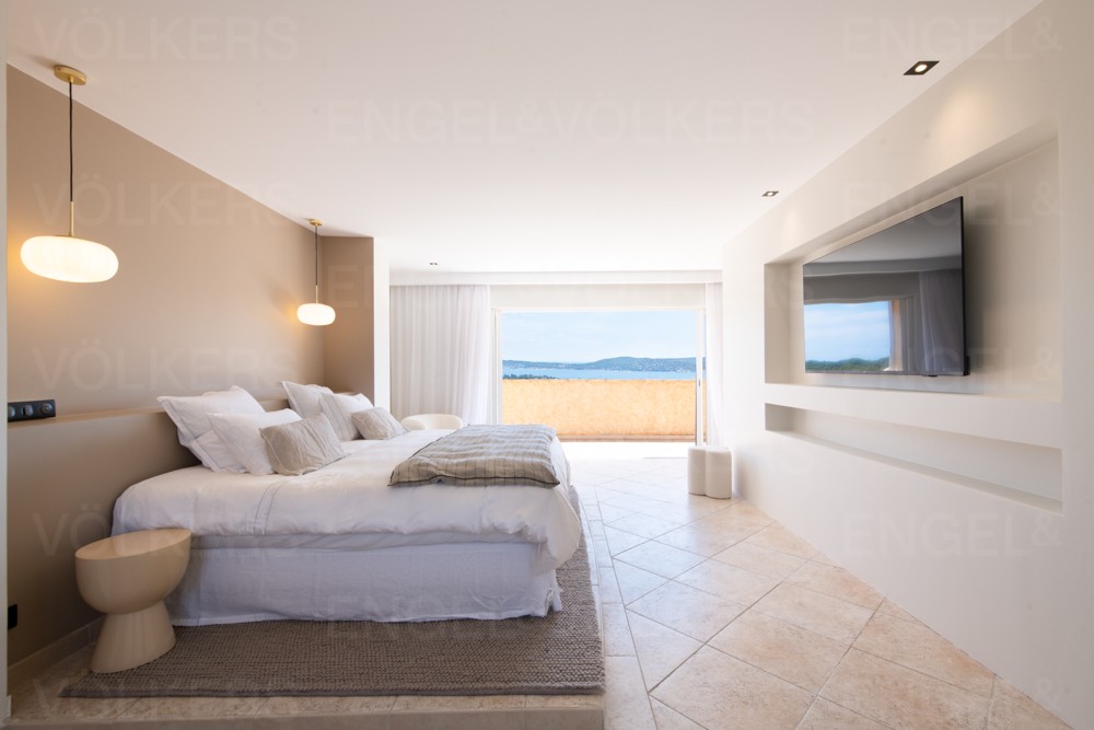 Dans un domaine privé et sécurisé proche de Saint Tropez, superbe villa lumineuse et moderne de 464m2 entièrement rénovée avec goût, avec un appartement de 78m2, sur un terrain de 4466m2 offrant une vue mer panoramique.
