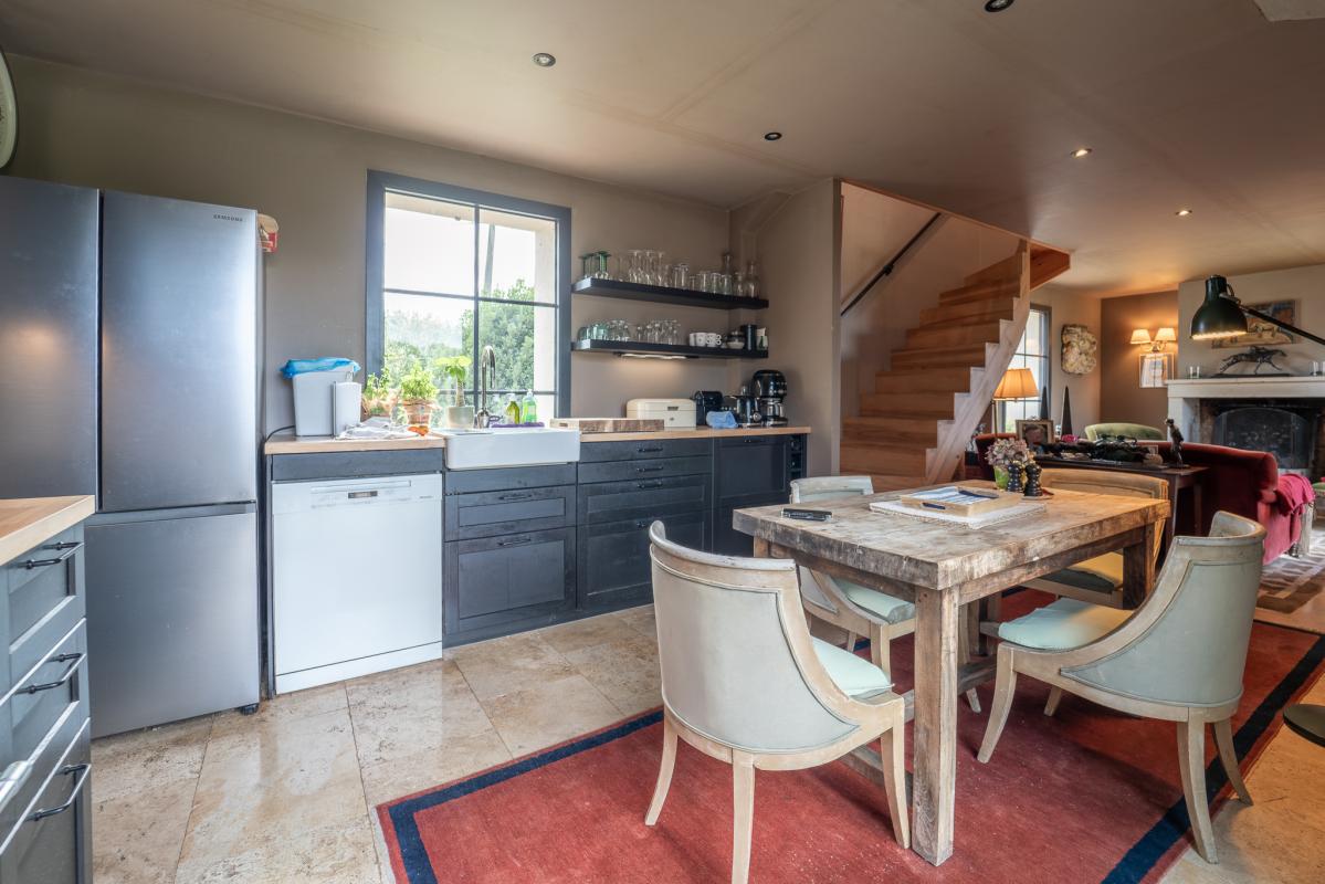 Sur 144 m² au total, l'ensemble dispose d'une entrée, une salle à manger avec cuisine ouverte, un salon avec cheminée, un bureau, des toilettes d'invités, trois chambres, deux salles de bains et un vaste atelier.