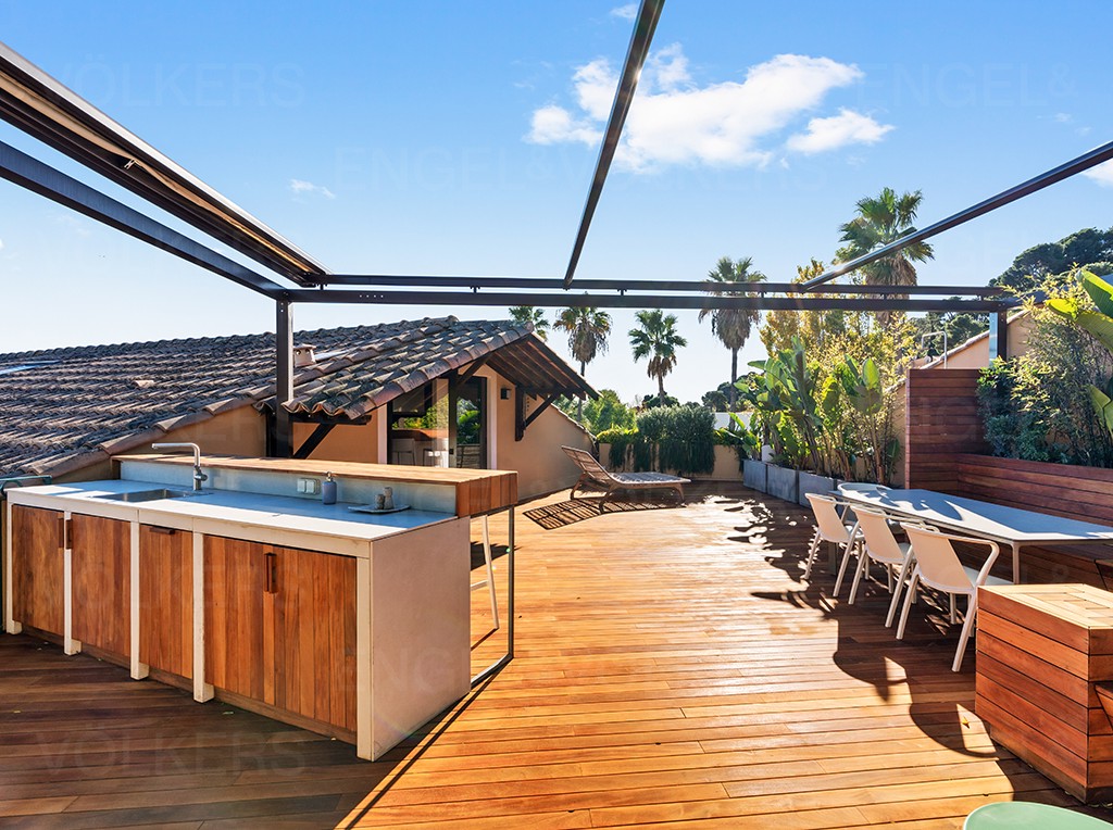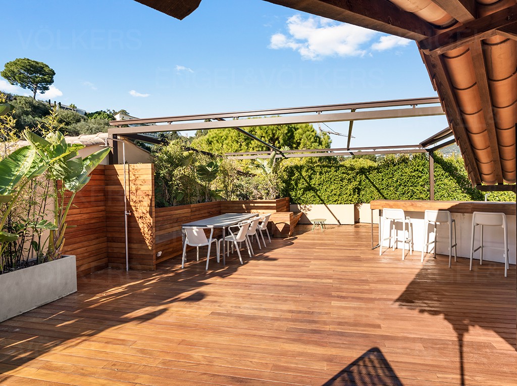 Cet appartement sur 2 étages peut rappeler une petite maison de village. Récemment rénové avec des matériaux de haute qualité et avec beaucoup de goût. La surface totale habitable de 118 m² pour une surface Loi Carrez de 101,38 m² comprend un séjour avec cuisine ouverte donnant sur une terrasse ensoleillée de 77 m² équipée d'une cuisine d'été, d'une douche extérieure, d'une belle pergola et de plusieurs coins de détente entourés de plantes.