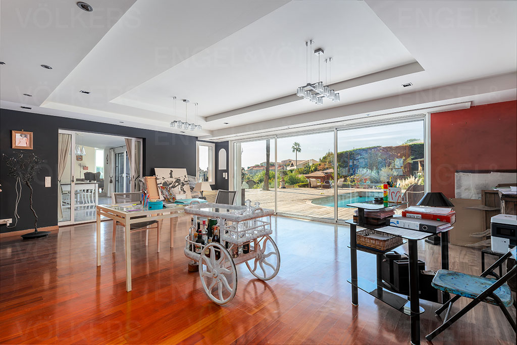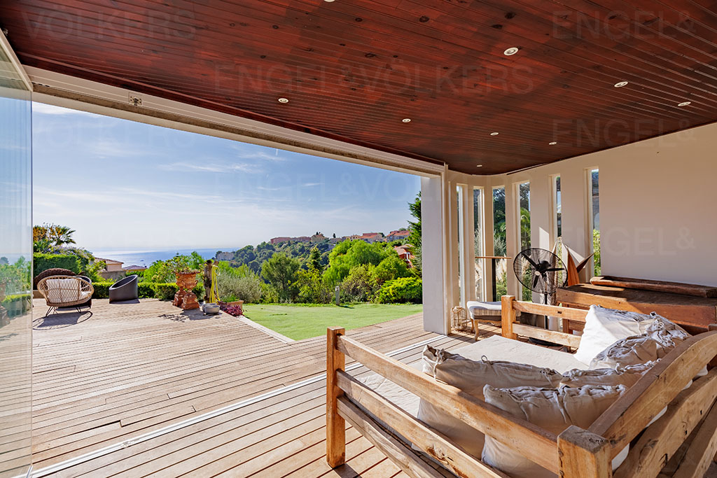 Un vaste séjour cathédrale lumineux ouvert sur une terrasse offrant une vue imprenable sur la mer Méditerranée, une cuisine indépendante équipée, 5 chambres dont une suite parentale avec salle de bains et dressing mais également plusieurs salles d'eau et espaces de rangement,