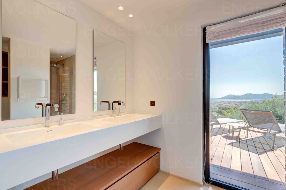 La villa, réalisée par un cabinet d'architecte de renom, comprend un vaste séjour avec vue mer, une cuisine ouverte également avec vue mer, 5 magnifiques chambres, dont une chambre de maître, 2 salles de bains, 3 salles d'eau, un bureau, ainsi qu'une grande cave à vin.