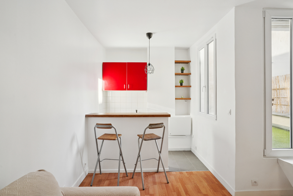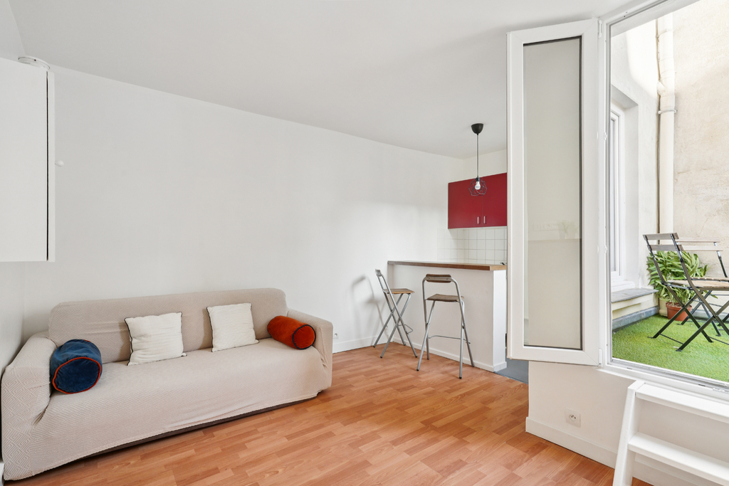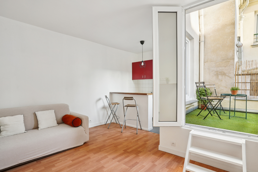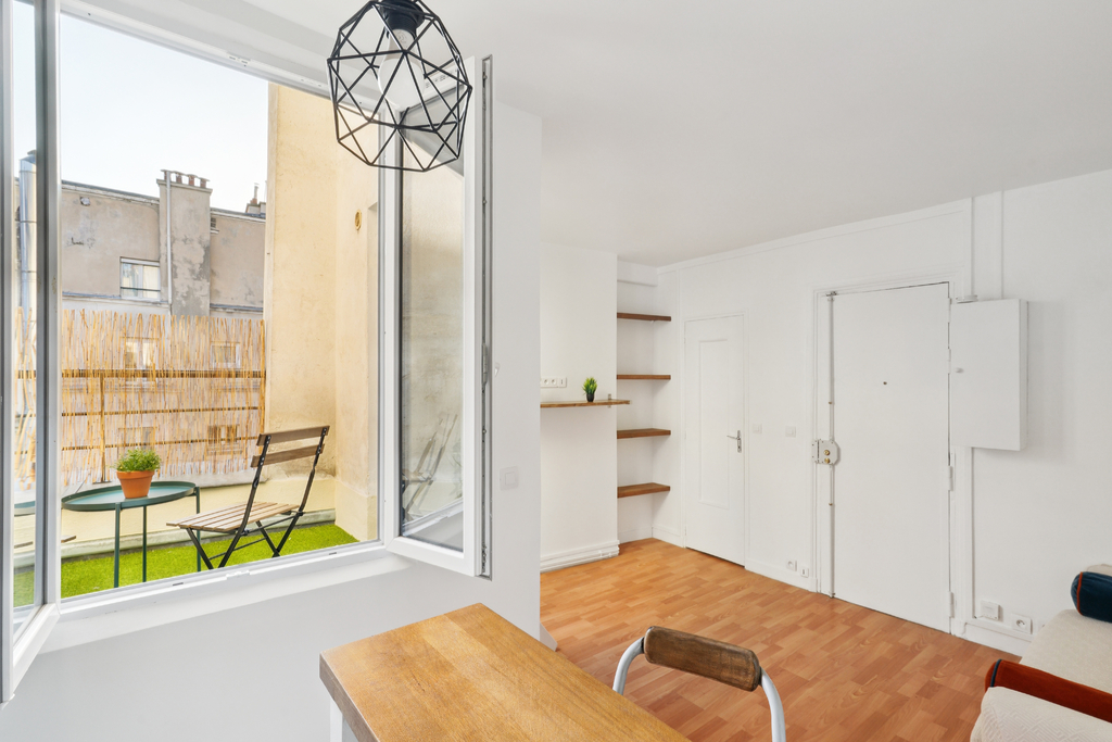 Baigné de lumière, l'appartement offre une pièce principale avec coin cuisine, une salle d'eau avec toilettes, ainsi qu'une rare terrasse privative de 4m², véritable atout pour profiter d'un espace extérieur en plein centre de la capitale.