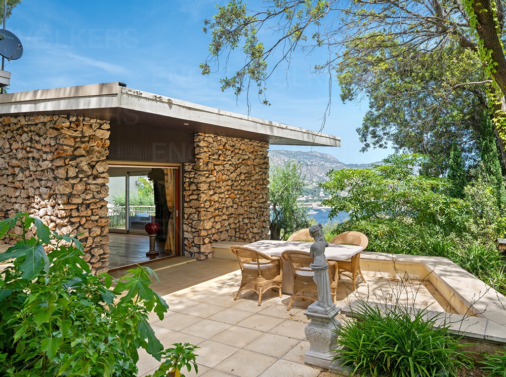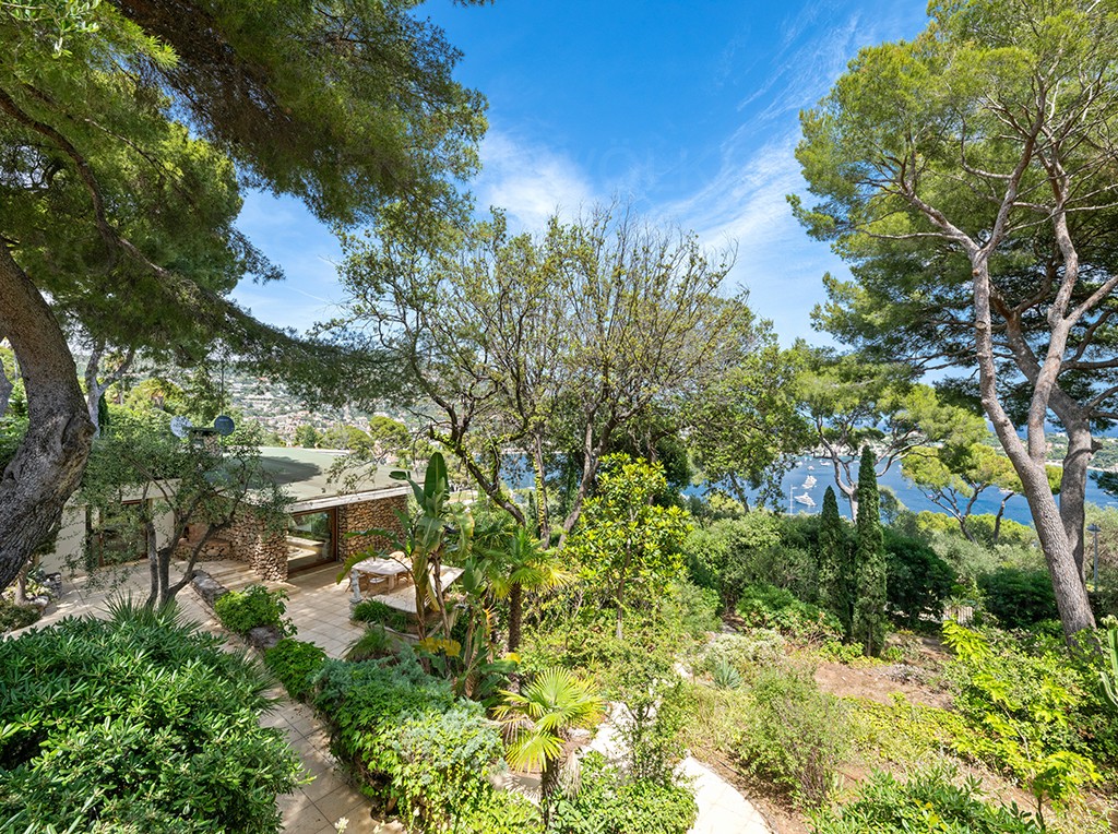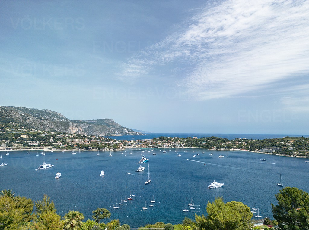 Propriété unique avec vue mer panoramique sur la baie de Villefranche et la péninsule de Cap Ferrat. Située dans un magnifique parc arboré de 2 513m² relativement plat.