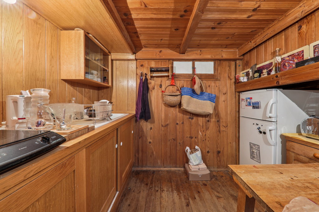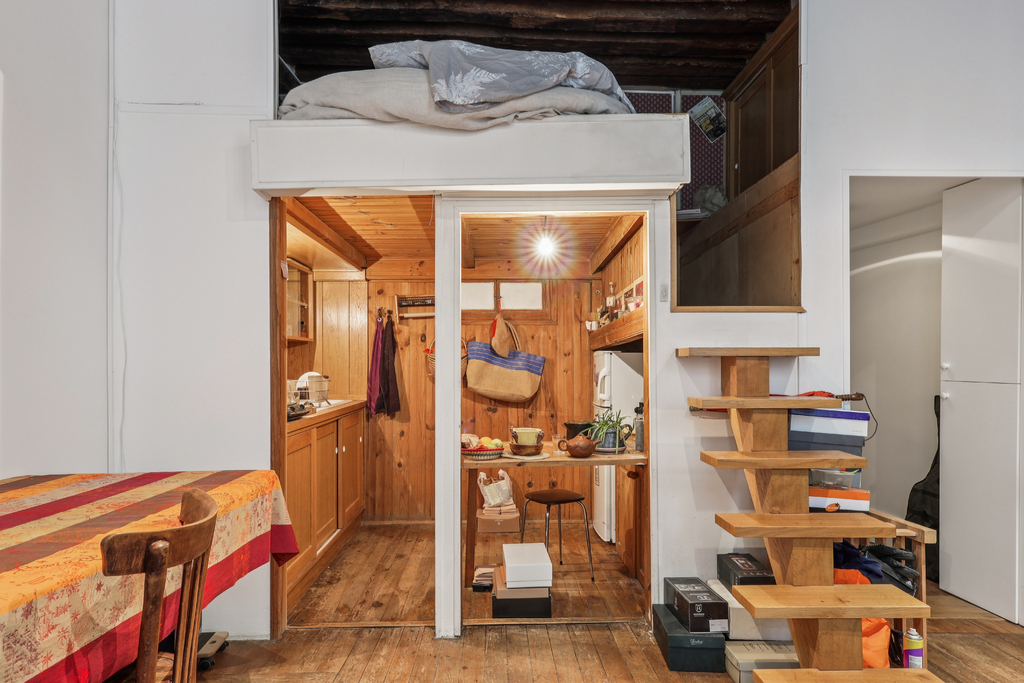 Dès l'entrée, la hauteur sous plafond de 3,50 m, les poutres apparentes et le parquet ancien révèlent tout le charme de l'ancien. L'espace, mêlant séjour, cuisine, chambre et deux mezzanines, offre un potentiel intéressant pour les amateurs de rénovation.