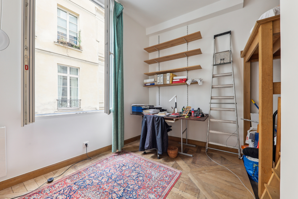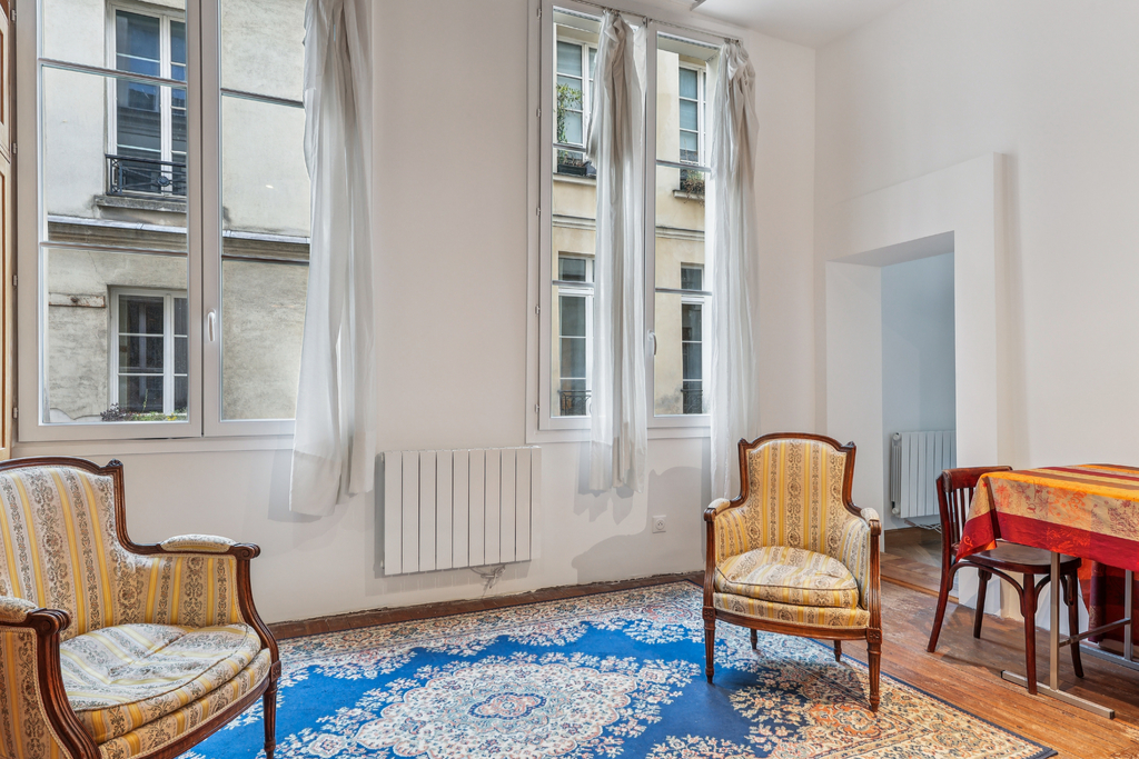 L'appartement bénéficie d'une vue agréable sur une rue piétonne et d'une atmosphère propre au Vieux Paris. Chaque détail raconte l'histoire d'un quartier chargé de caractère.