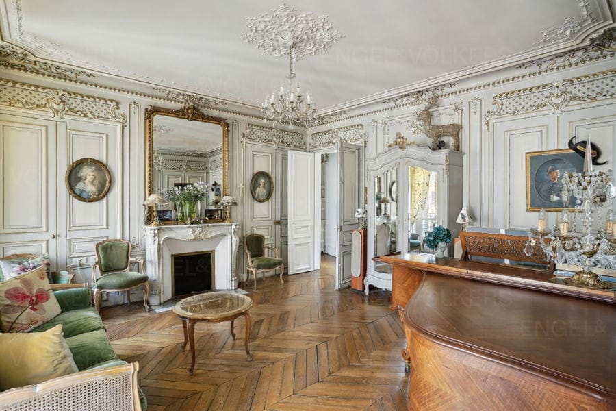 L'appartement s'ouvre sur un vaste salon de réception aux volumes remarquables (3,03 m de hauteur sous plafond), doté d'un parquet point de Hongrie, de moulures Louis XV redorées, de cheminées en marbre fonctionnelles, de miroirs d'époque et d'un balcon filant de 5,8 m² avec vue dégagée sur de superbes façades parisiennes. Vivez dans un petit Versailles au coeur de Paris !