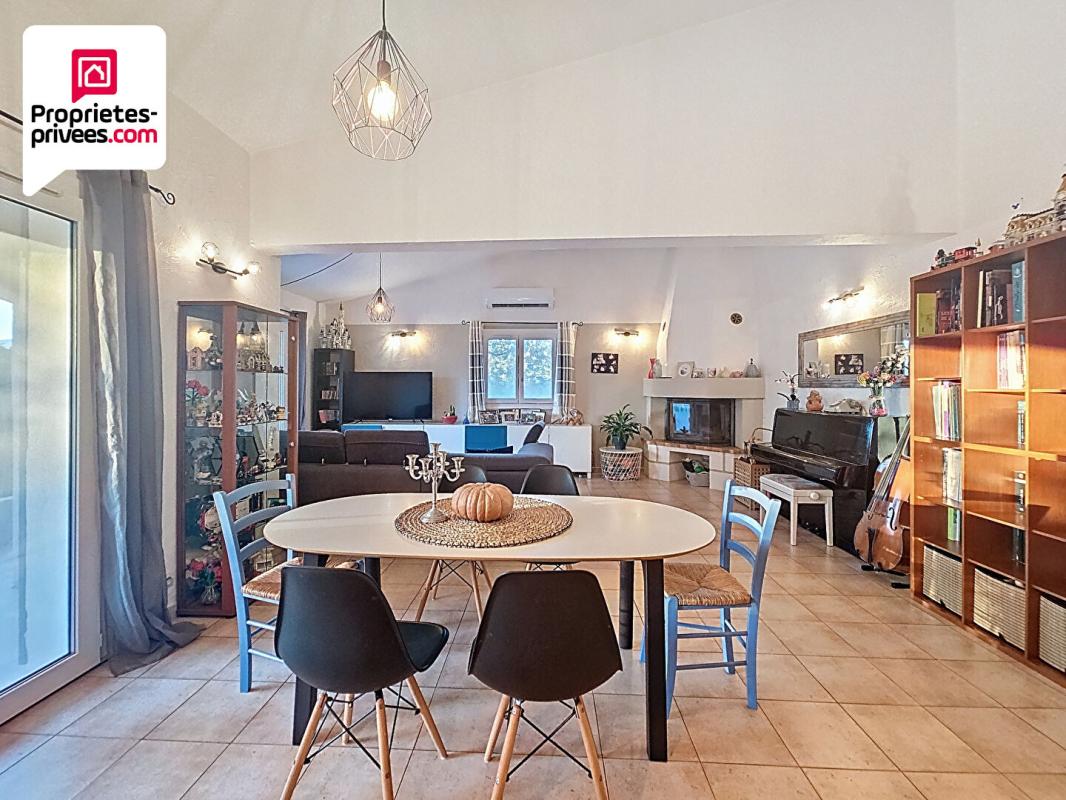 L'entrée s'ouvre sur un spacieux salon-séjour lumineux, avec belle hauteur sous plafond et cheminée insert, offrant un espace convivial et chaleureux.