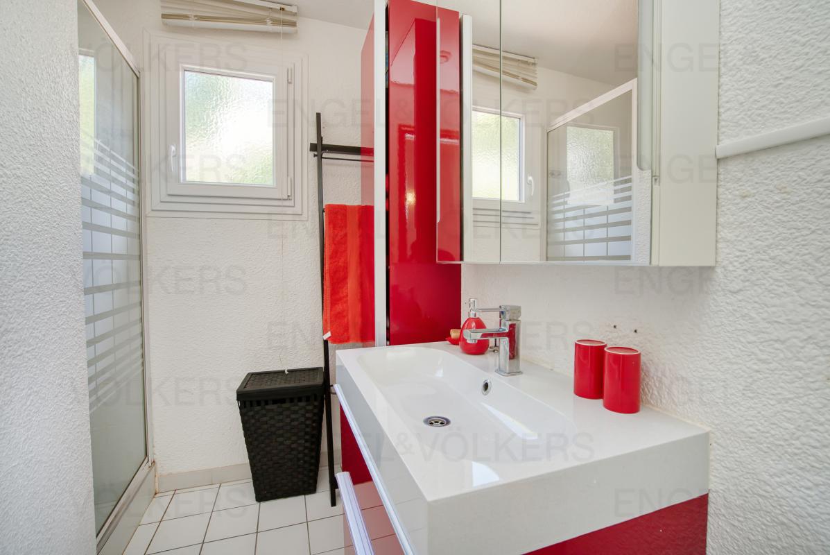 En rez-de-jardin, sur environ 80 m², on découvre une grande pièce de vie ouverte sur une cuisine américaine entièrement équipée, deux chambres - l'une avec sa salle d'eau privative, l'autre avec salle de bains, vasque et rangements -, ainsi qu'une seconde terrasse de 40 m², également exposée au sud, prolongée par l'espace piscine.