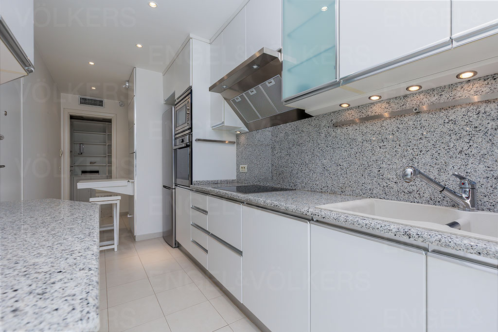 La cuisine séparée est entièrement équipée en électroménager de grandes marques, lave-linge, sèche-linge, lave-vaisselle, fours encastrés et possède un accès sur un balcon.