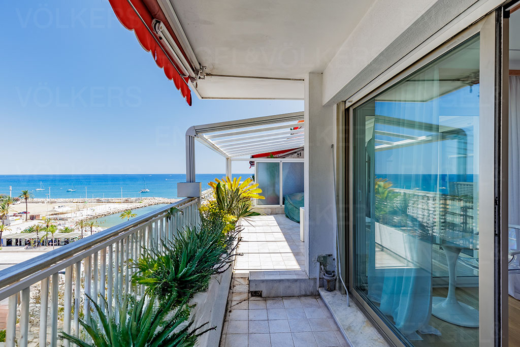 Proche des établissements balnéaires des Sablettes, dans une résidence de standing en bord de mer, cet appartement traversant situé en dernier étage avec vue mer.